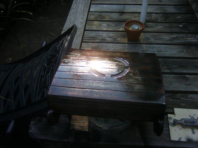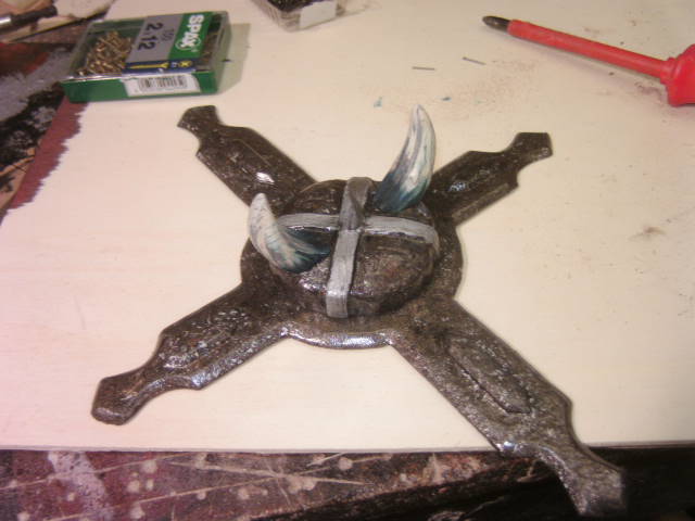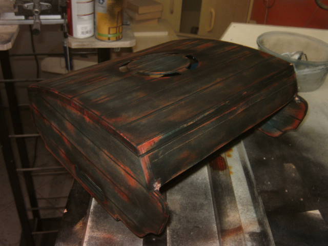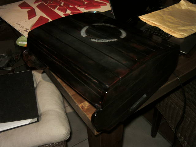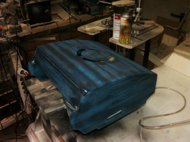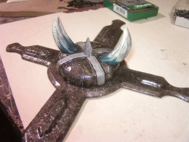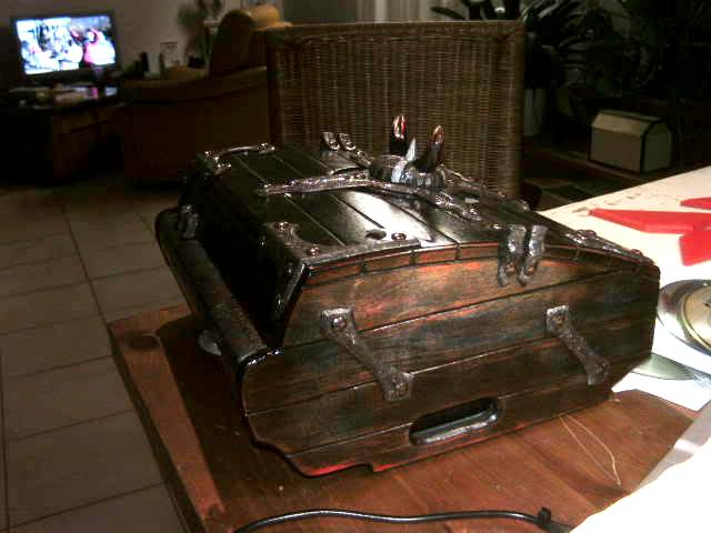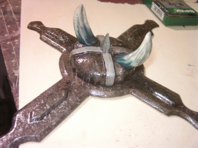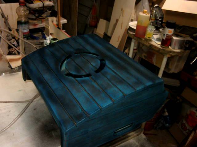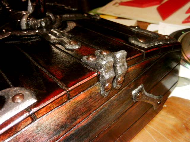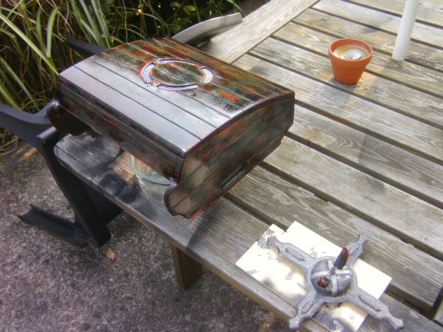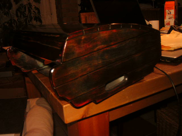 die kiste selber wird noch bearbeitet wenns trocken ist. soll diese typische blaue farbe der vikinger und schotten darstellen, muss noch uneben geschliffen werden. es war von der woad pflanzen pigmente gemacht und sehr definieren, auch über tausend jahre von die vikinger in uk landeten. sogar die pichten haben es benutzt. ihr kennt es eher wahrscheinlich aber von william wallace in braveheart. da mann später seitlich nicht mehr mit der finger ran kommt um die karten slot zu öffnen habe ich ein vikinger axt kopf dran montiert