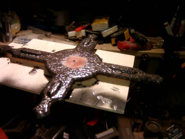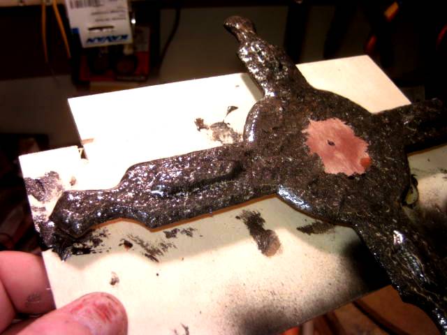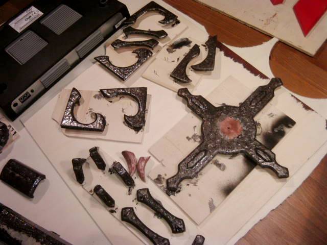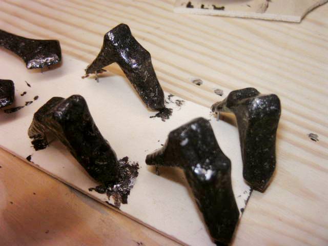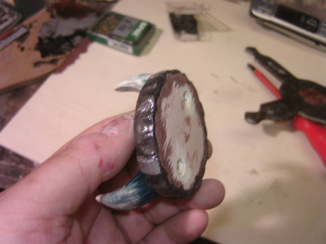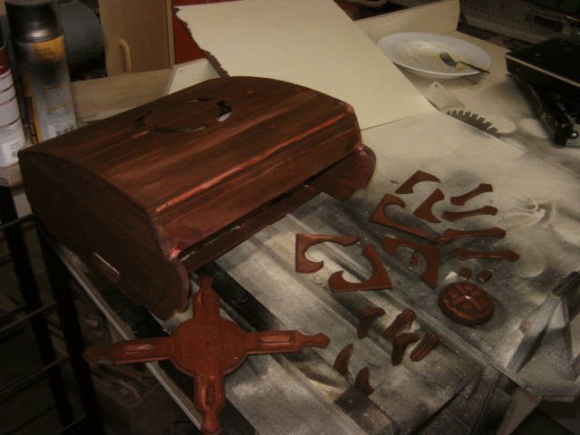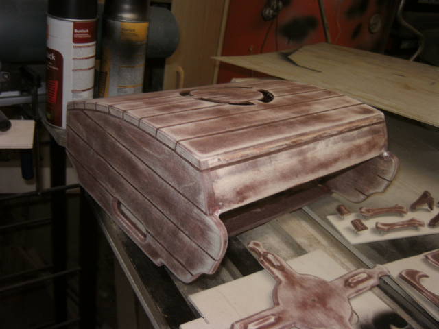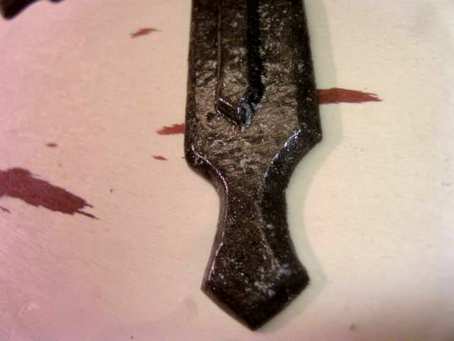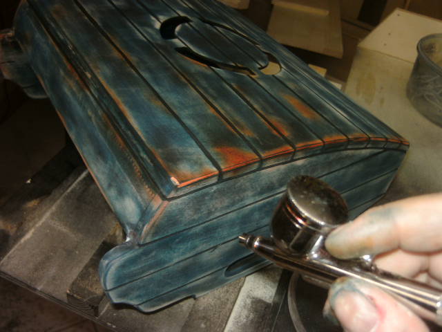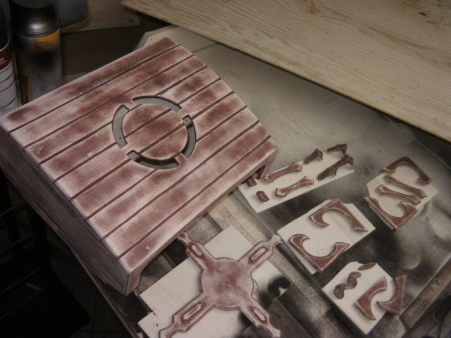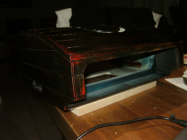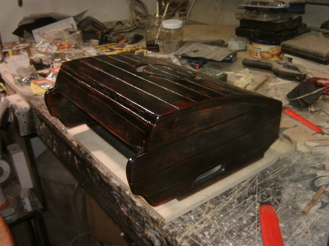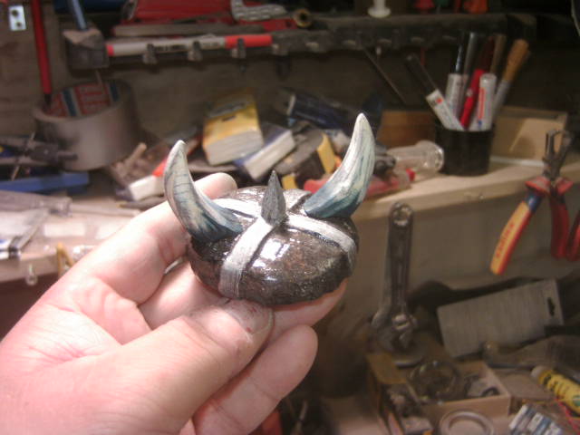 die kiste selber wird noch bearbeitet wenns trocken ist. soll diese typische blaue farbe der vikinger und schotten darstellen, muss noch uneben geschliffen werden. es war von der woad pflanzen pigmente gemacht und sehr definieren, auch über tausend jahre von die vikinger in uk landeten. sogar die pichten haben es benutzt. ihr kennt es eher wahrscheinlich aber von william wallace in braveheart. da mann später seitlich nicht mehr mit der finger ran kommt um die karten slot zu öffnen habe ich ein vikinger axt kopf dran montiert