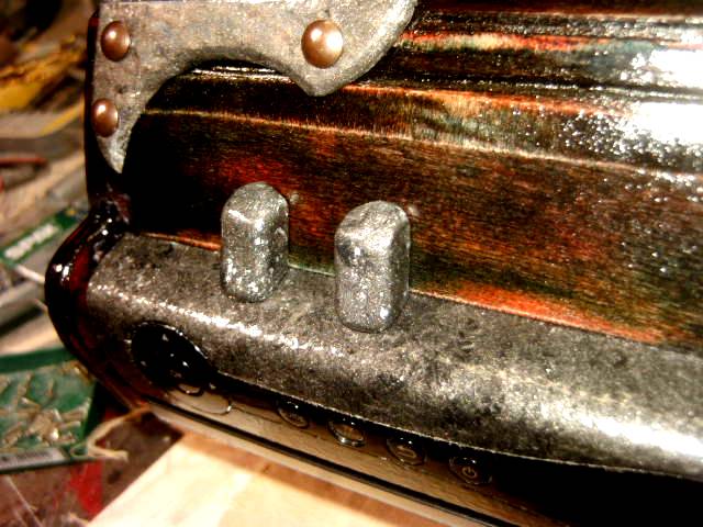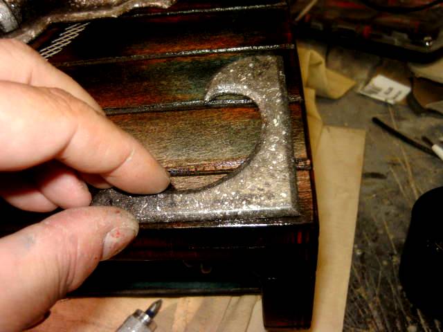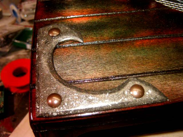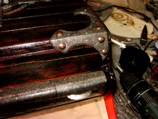 und hier noch ein paar fotos, die beschläge sind montiert. ich habe die schraubköpfe geschliffen so da die unter halb der stud passt. das sing kupfer look polsternagel stud, passen gut, glänzen nicht zu viel.