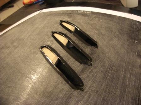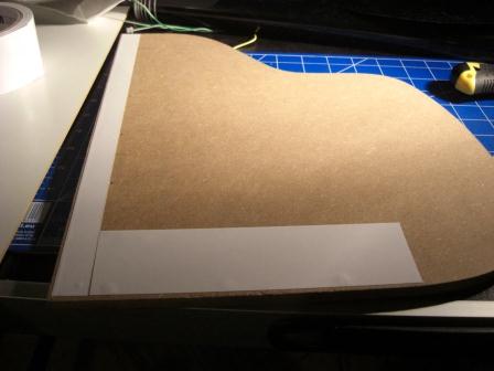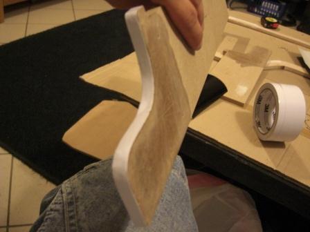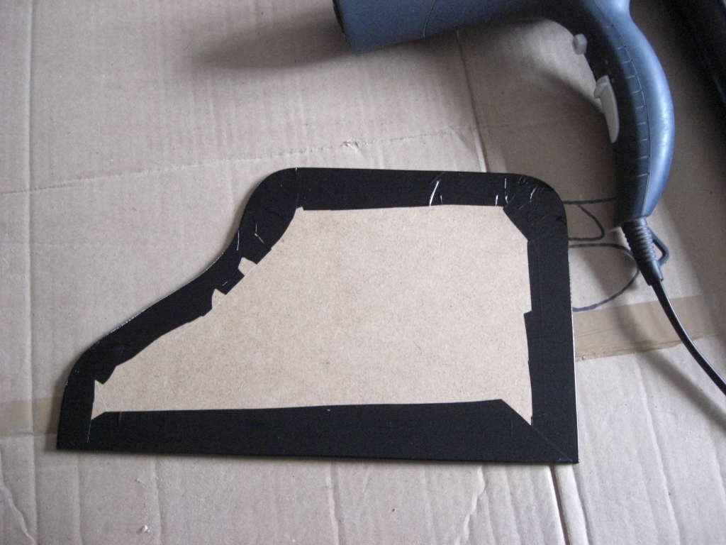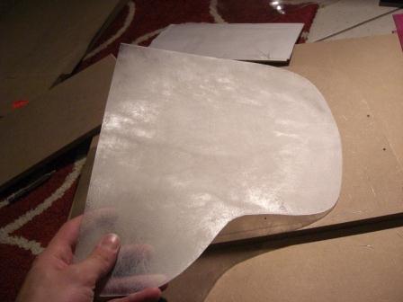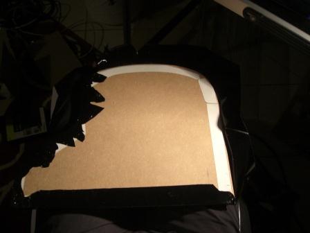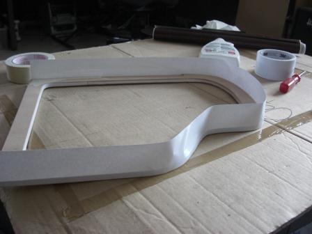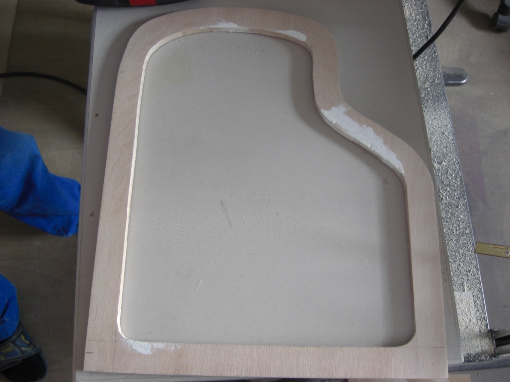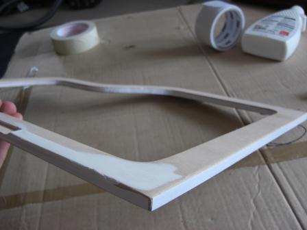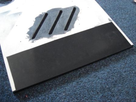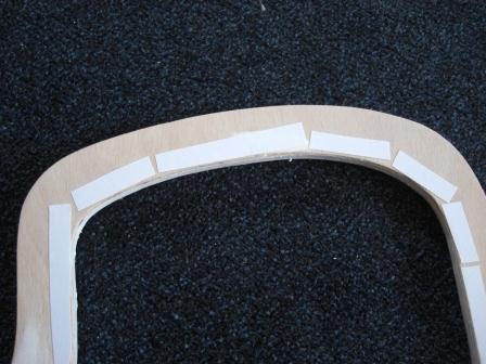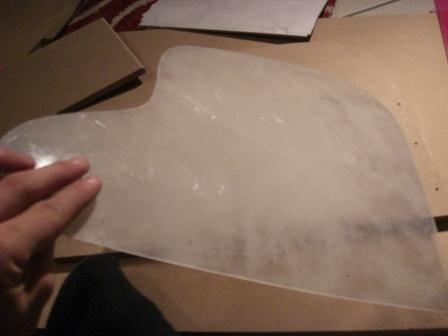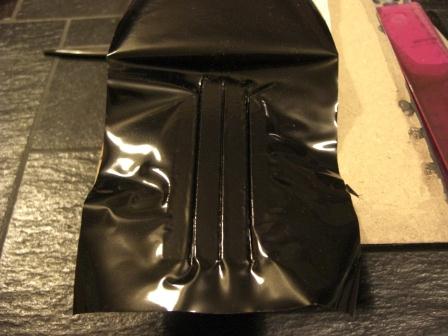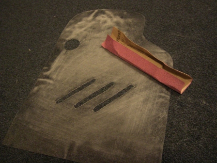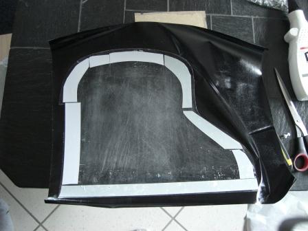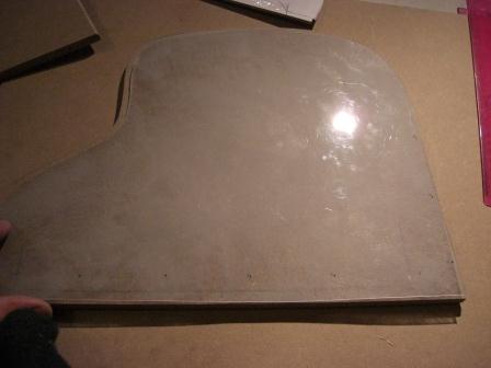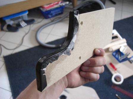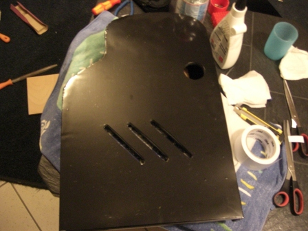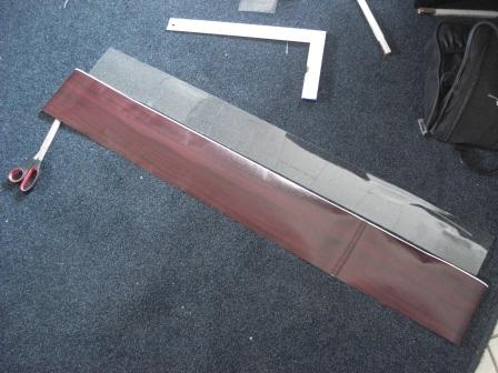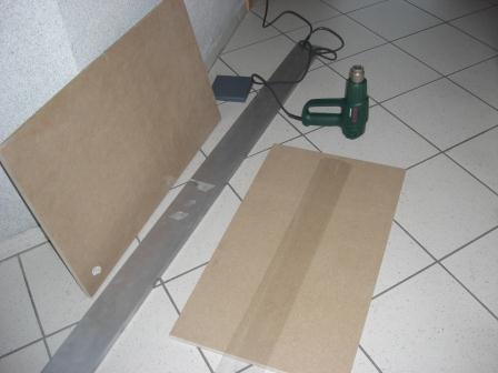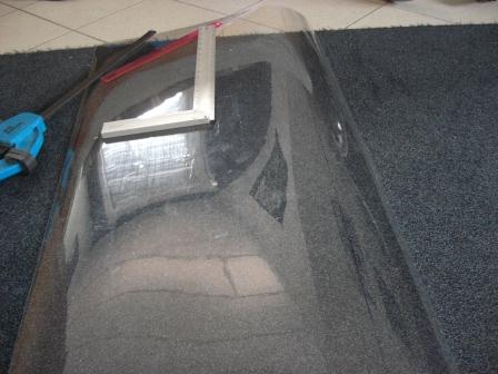 1) Vorbereiten des Rollenglases für die Verkleidung des Bodens. Hierbei das Rollenglas passend ausschneiden und vielleicht mit einem normalen Föhn bearbeiten, damit die Eigenspannung etwas herausgeht. Das sorgt später für besseren Halt. Die Rückseite mit Schmiergelpapier anrauen, damit es sich später besser leimen lässt. (Bilder 136-138 )