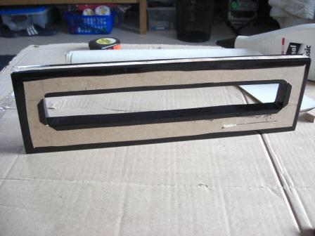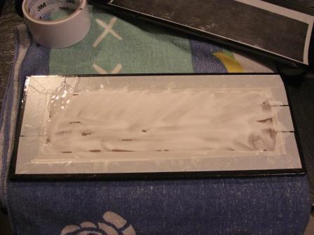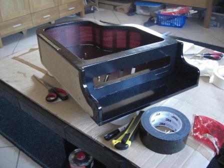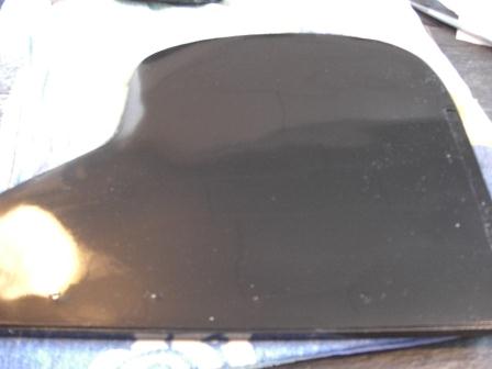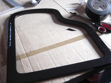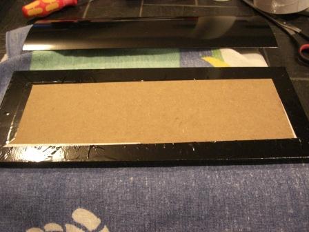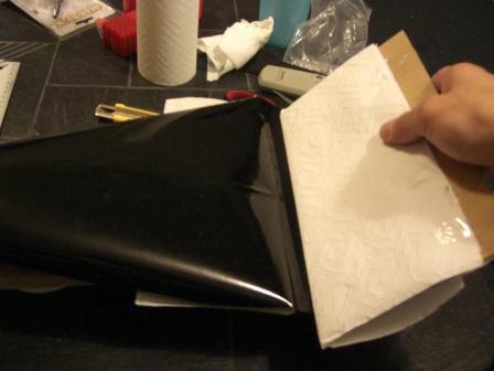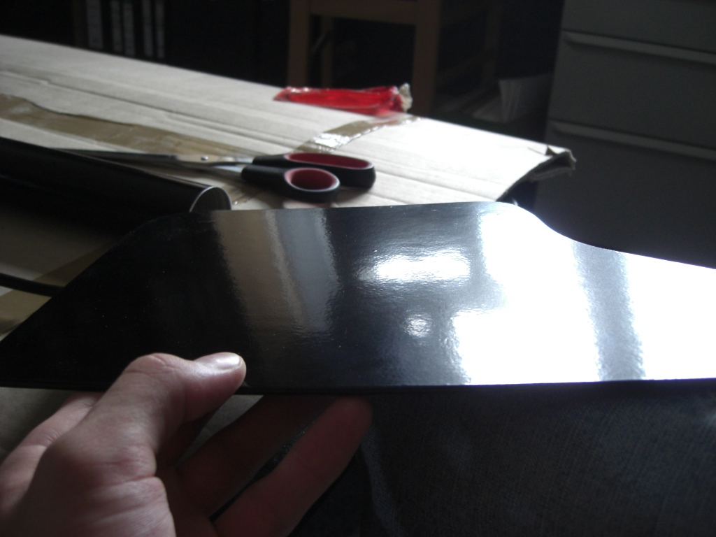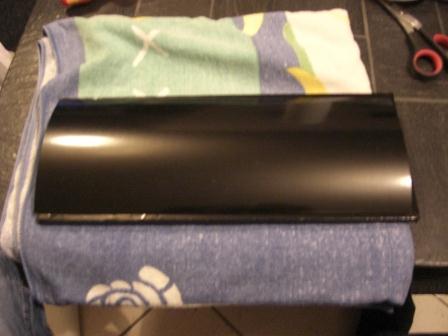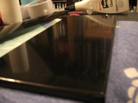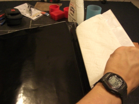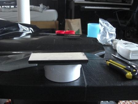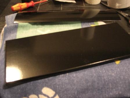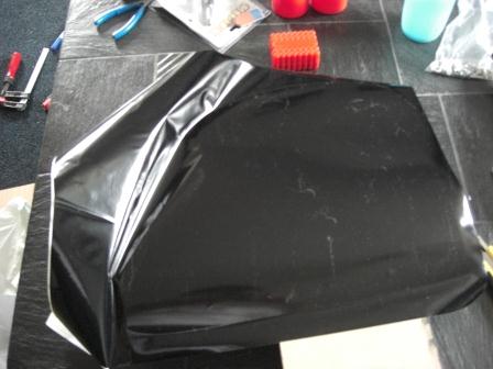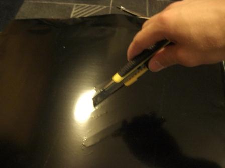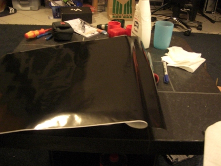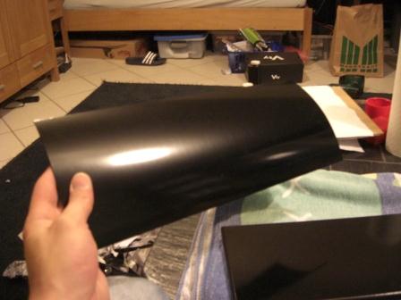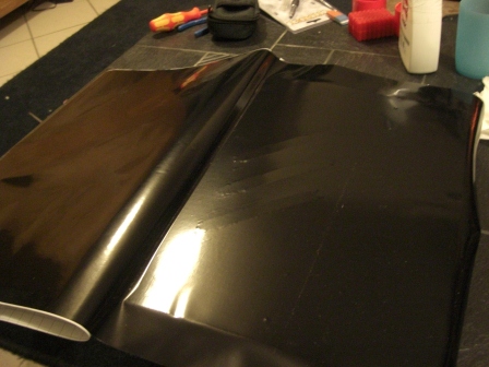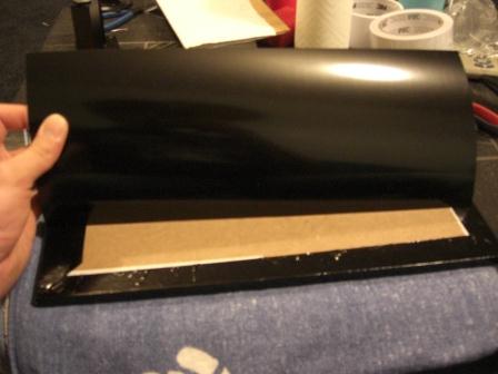 2) Beziehen des Rollenglases mit schwarzer Hochglanzfolie. Die Ränder der Rückseite mit Doppelklebeband versehen. Das Teil mit Hochglanzfolie beziehen, dabei darauf achten eine Vorrichtung zu bauen mit der man es blasenfrei hinkriegen kann. (siehe Bild 144)