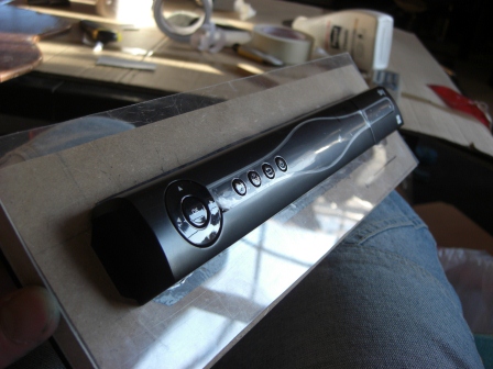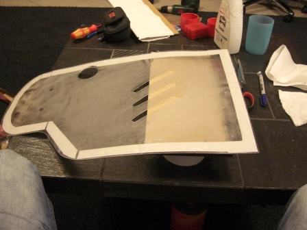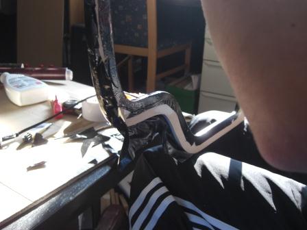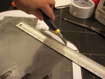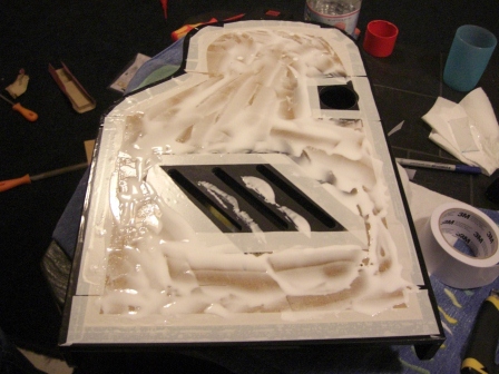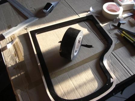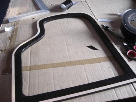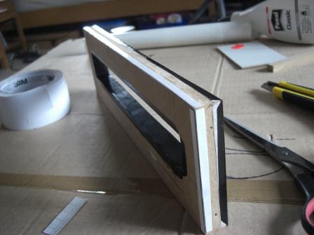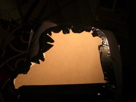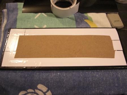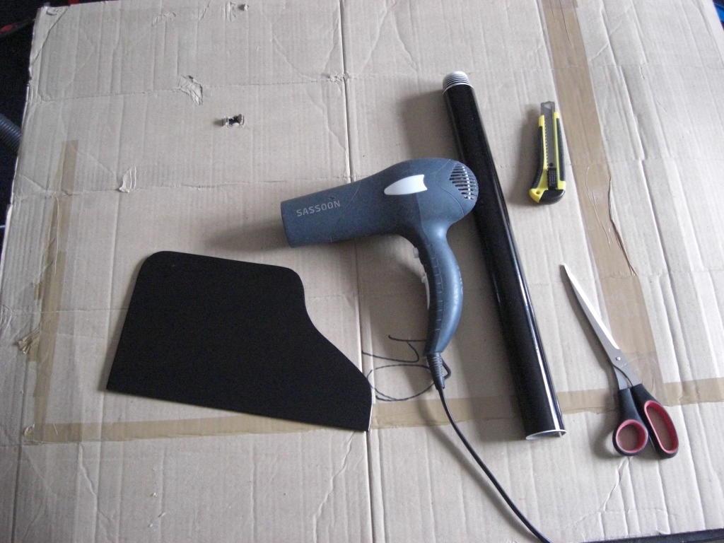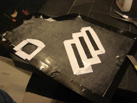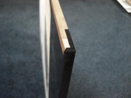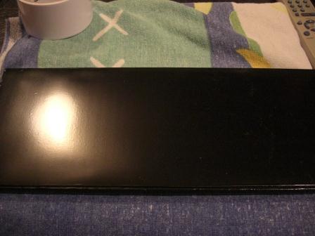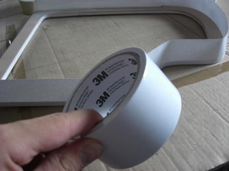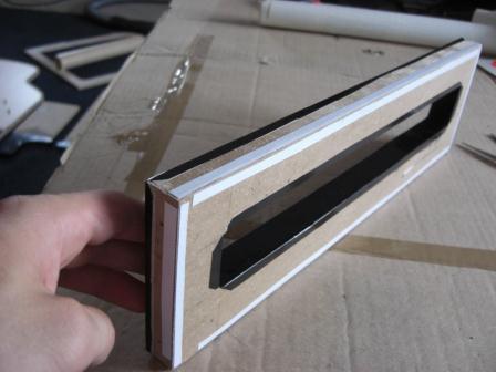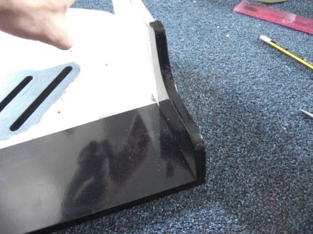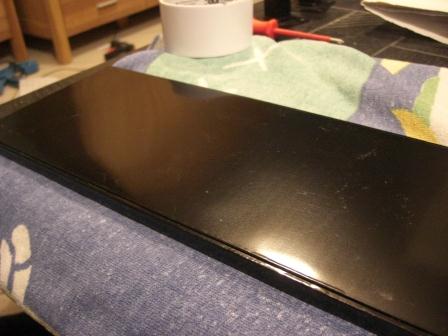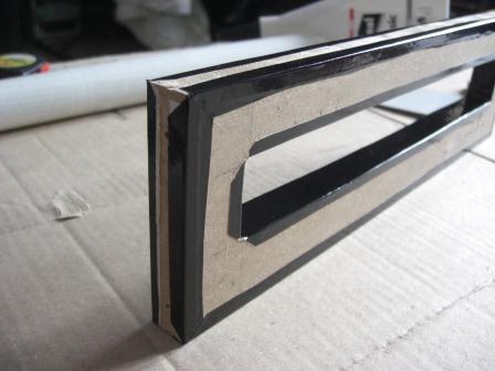 2) Beziehen des Rollenglases mit schwarzer Hochglanzfolie. Die Ränder der Rückseite mit Doppelklebeband versehen. Das Teil mit Hochglanzfolie beziehen, dabei darauf achten eine Vorrichtung zu bauen mit der man es blasenfrei hinkriegen kann. (siehe Bild 144)