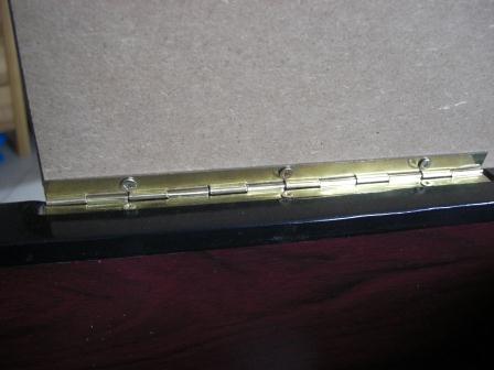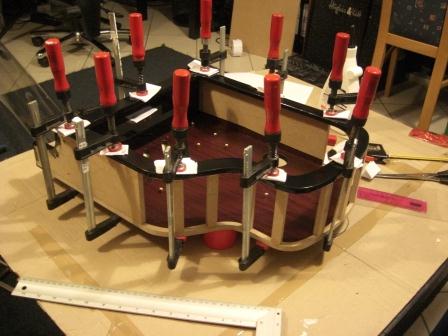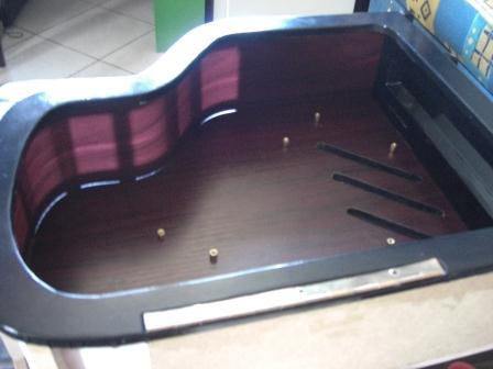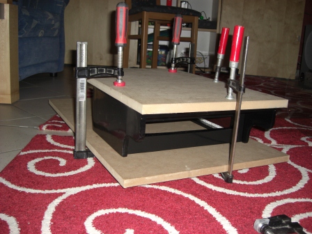 3) Kleben des Verkleidungsstückes mit dem Boden. Hierbei die Ränder und Lüftungsschlitze am Boden mit Doppelklebeband versehen. Ich habe etwas übertrieben und das sowohl auf der Unterseite des Klaviers als auch auf dem Teil selber gemacht. Die MDF-freie Fläche mit Leim versehen und das Teil aufkleben. Mein Fehler: Ich habe nicht bedacht, dass die Löcher für die Füße an den gleichen Stellen sein mussten wie auf der Platte und habe es einfach nach Lust und Laune aufgeklebt. Später beim Anschrauben der Füße habe ich gemerkt, dass sich die Schrauben teilweise nur schräg reinschrauben lassen, weil vermutlich die Löcher des Rollenglases mit den Löchern der MDF-Platte nicht exakt übereinstimmen. Was solls, hauptsache die Füße lassen sich anschrauben. :D Das Ganze später in einer Pressvorrichtung leicht pressen. (Bilder 153-160)