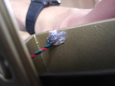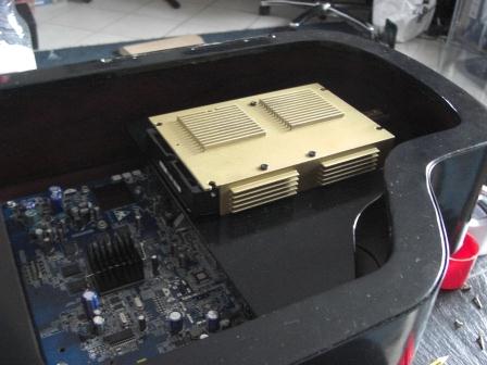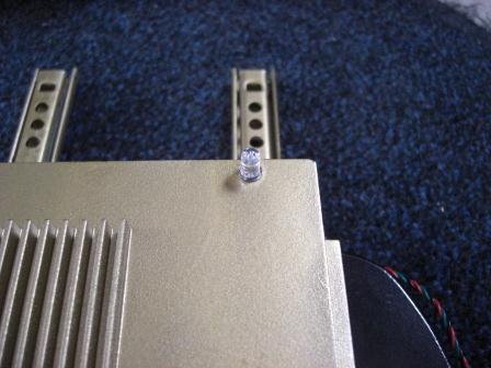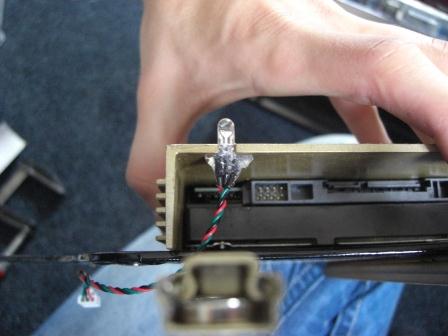 6) Kleben der Festplatten-LED. Ich habe mich dafür entschieden die Festplatten-LED an die Kühlerplatte der Festplatte anzukleben. Wie man sieht habe ich die gute alte Heißklebepistole verwendet.