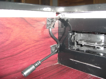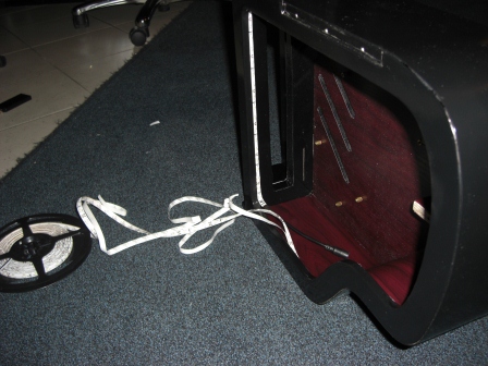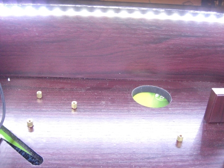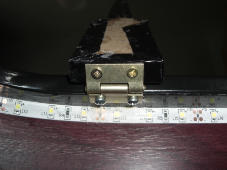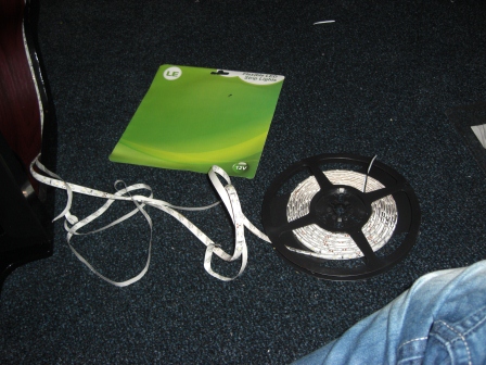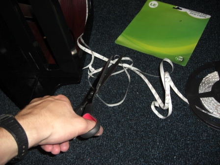 LED-Strip passend abschneiden und direkt unter den Rahmen kleben. Was ich hier unbedingt vermeiden wollte war, dass man direkt in die LED's gucken kann. Hat aber nicht ganz geklappt, weil ich diese nicht weit genug unter den Rahmen verstecken konnte. Zum Schluß den Steckerbereich des Strips mit den Kabelbinderklebeplätchen absichern.