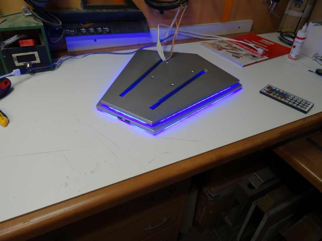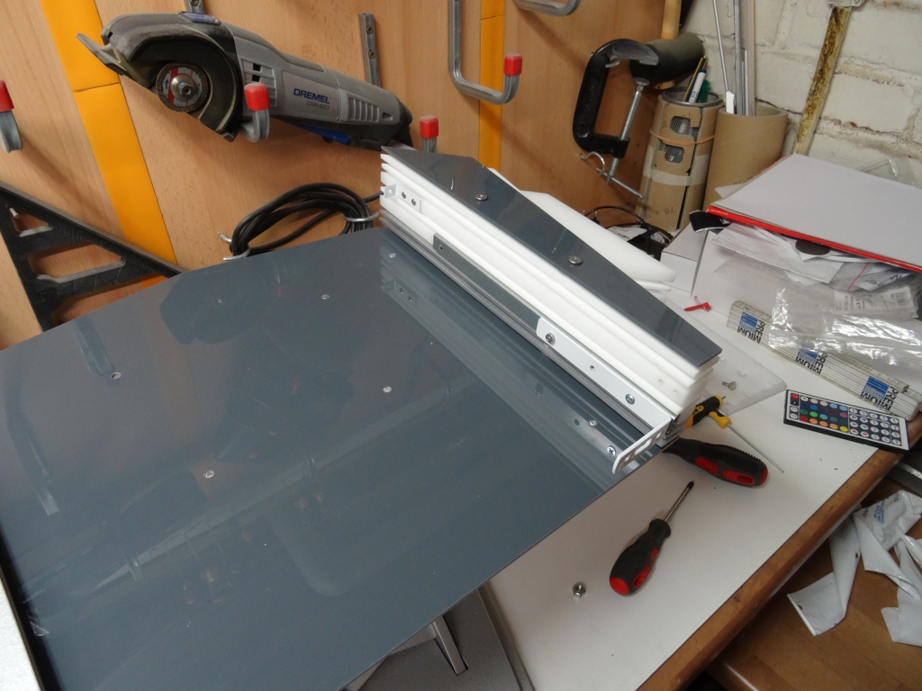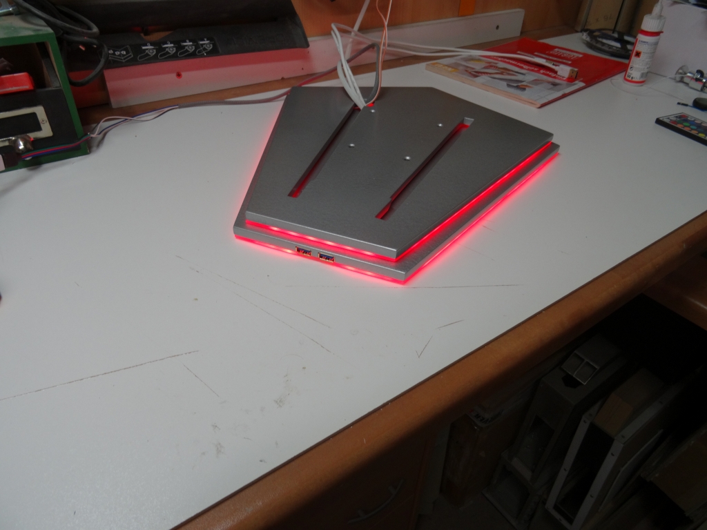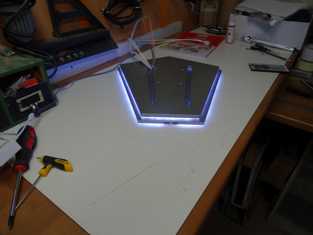 Beleuchtung schaut klasse aus. Wolltest die die Fleyligth zuerst aufs Plexi kleben so das das Alu in der Nut reflektiert ?
