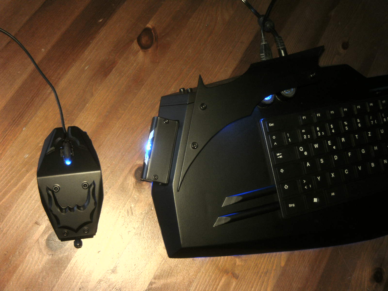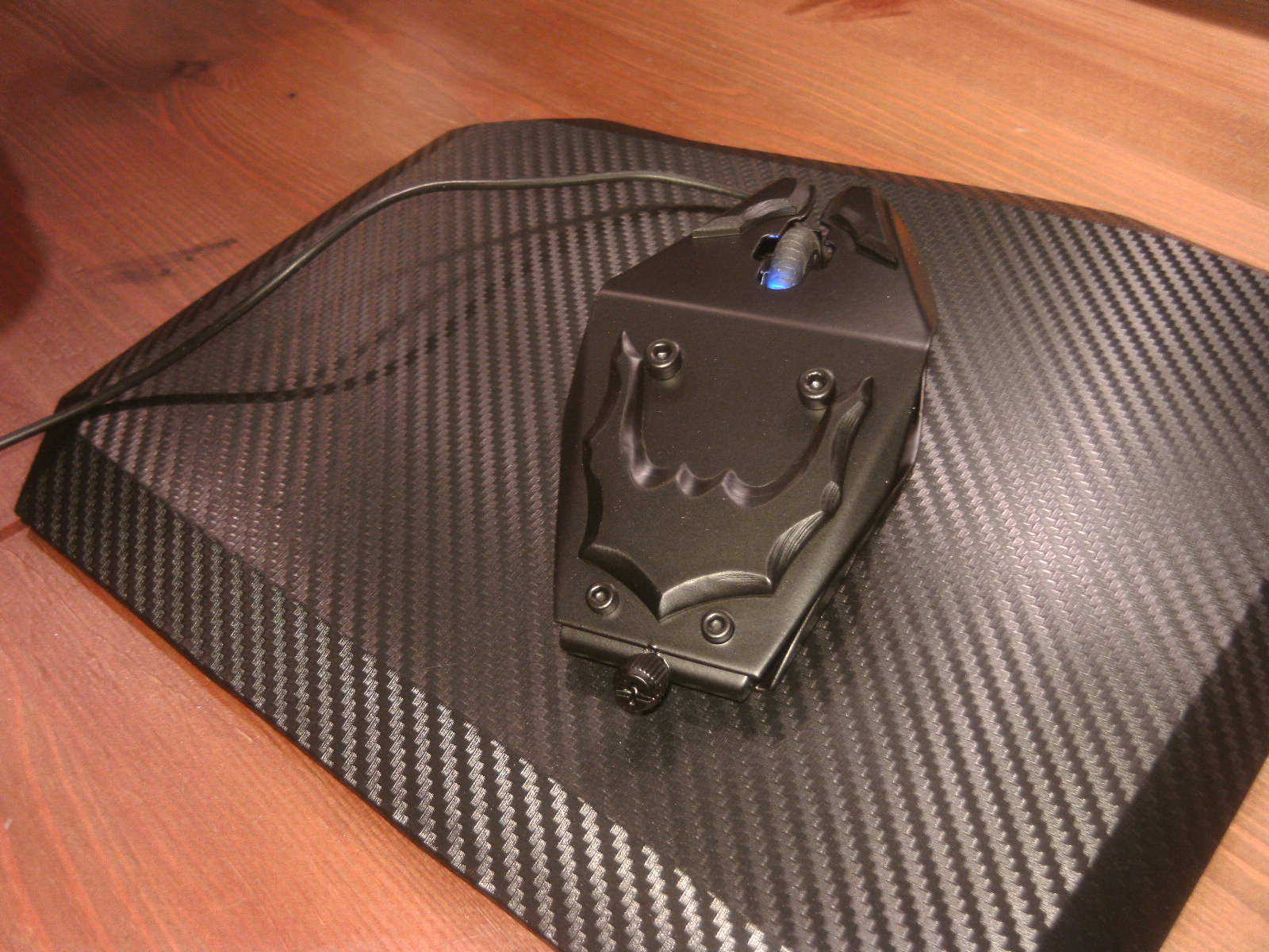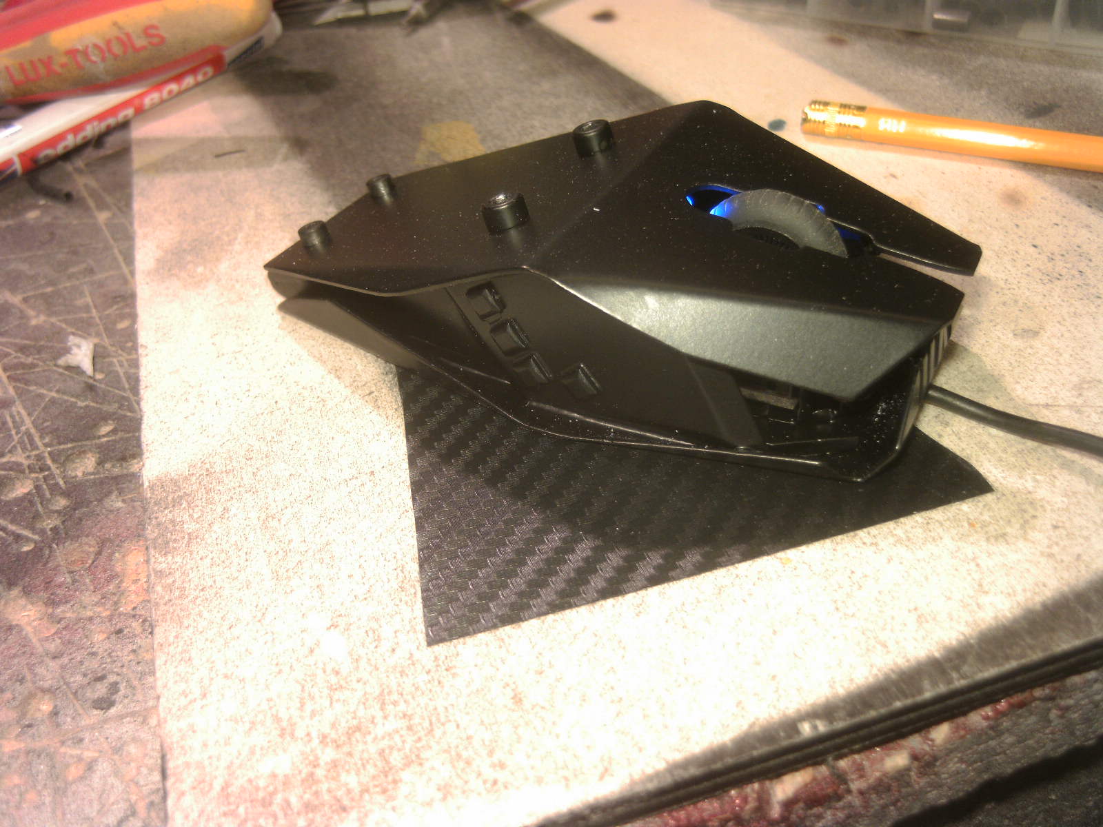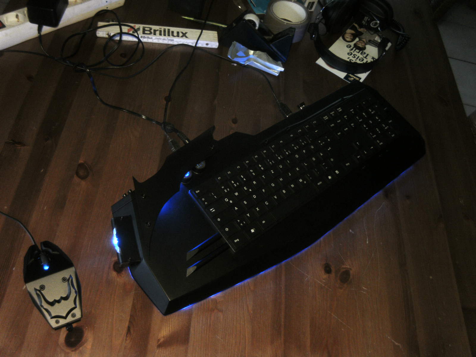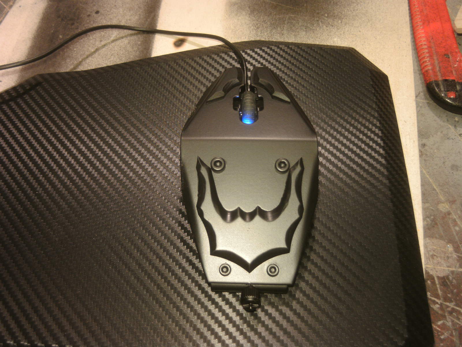 ja denke ich auch. mouse ist fertig, samt bat DK verzierungen. ein led habe ich auch in DK blau hinter dem rad eingelötet. nachdem ich es positiv getestet habe, habe auch das erste teile vom mousepad mit folie fertig, ein bodenplatte mache ich vielleicht nich, weis nicht. kaum zu glauben das es vor 4 tage noch ein hdd case war.Denke die Maus wird am ende sehr gut dazu passen.