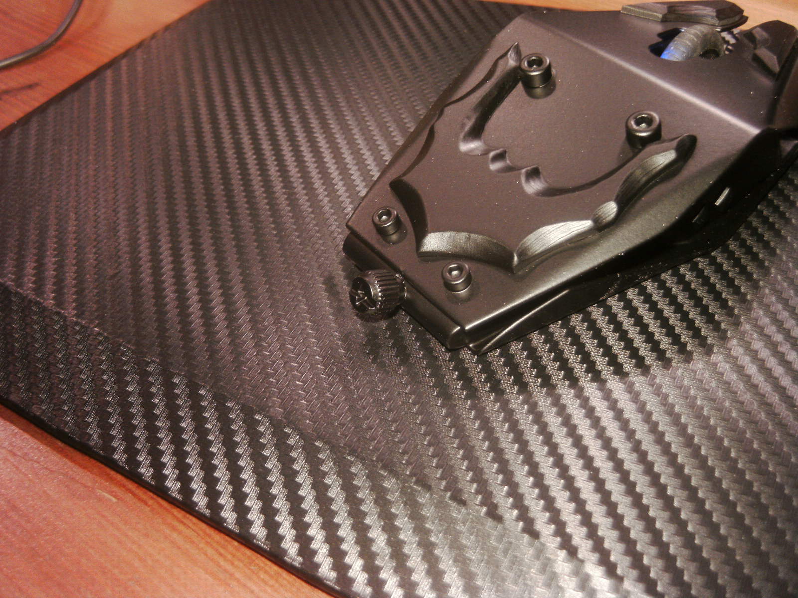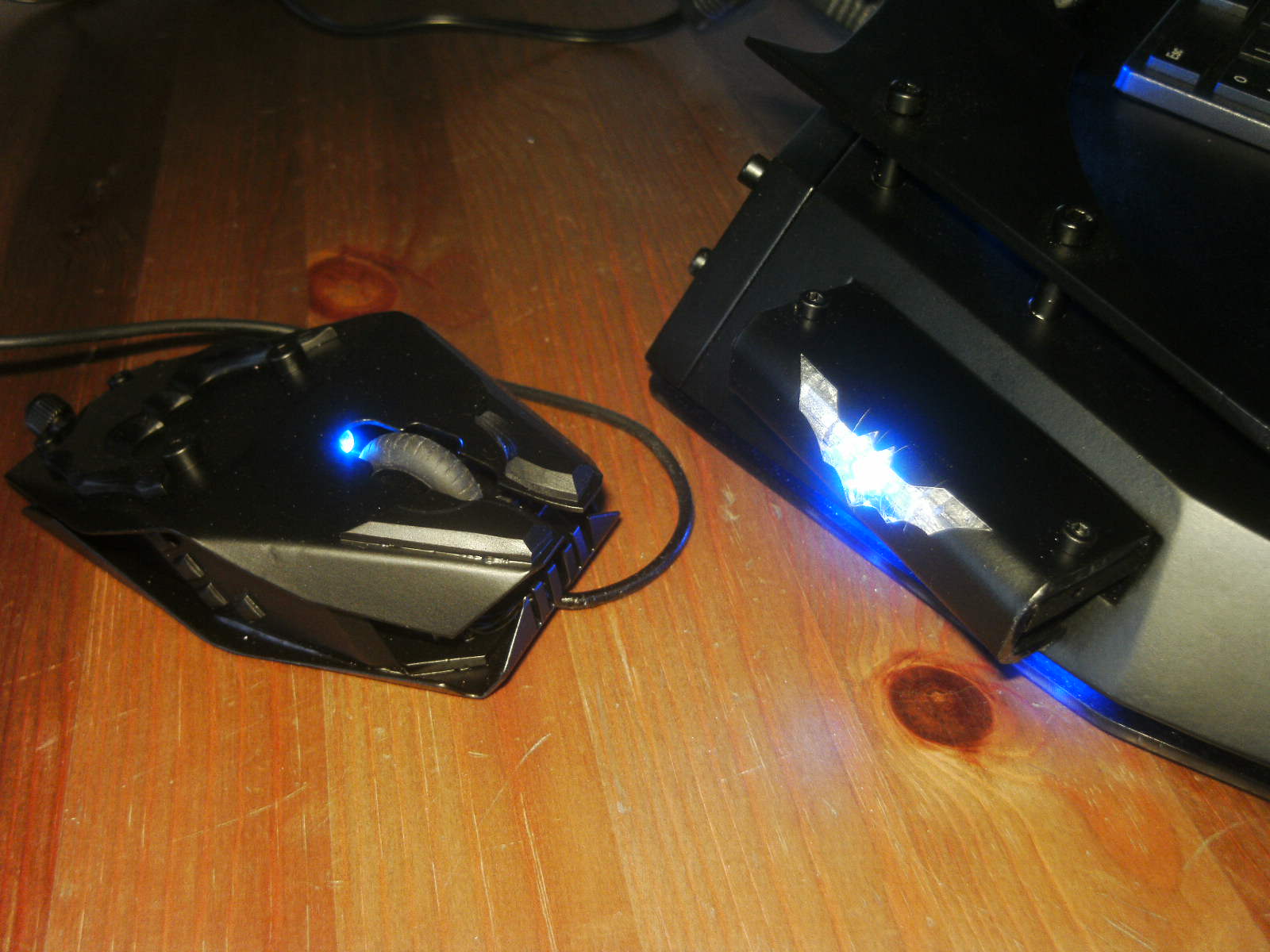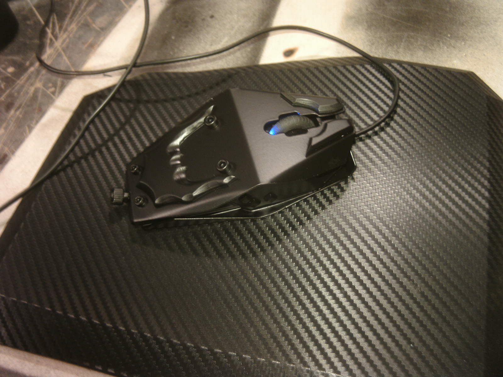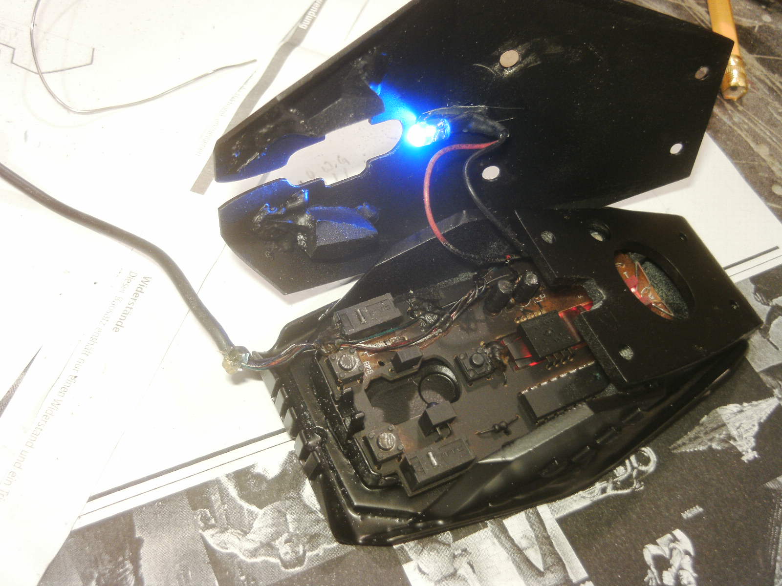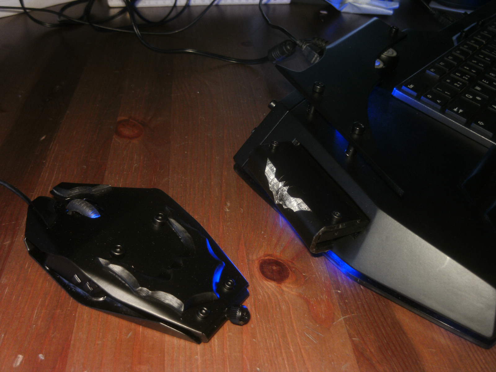 ja denke ich auch. mouse ist fertig, samt bat DK verzierungen. ein led habe ich auch in DK blau hinter dem rad eingelötet. nachdem ich es positiv getestet habe, habe auch das erste teile vom mousepad mit folie fertig, ein bodenplatte mache ich vielleicht nich, weis nicht. kaum zu glauben das es vor 4 tage noch ein hdd case war.Denke die Maus wird am ende sehr gut dazu passen.