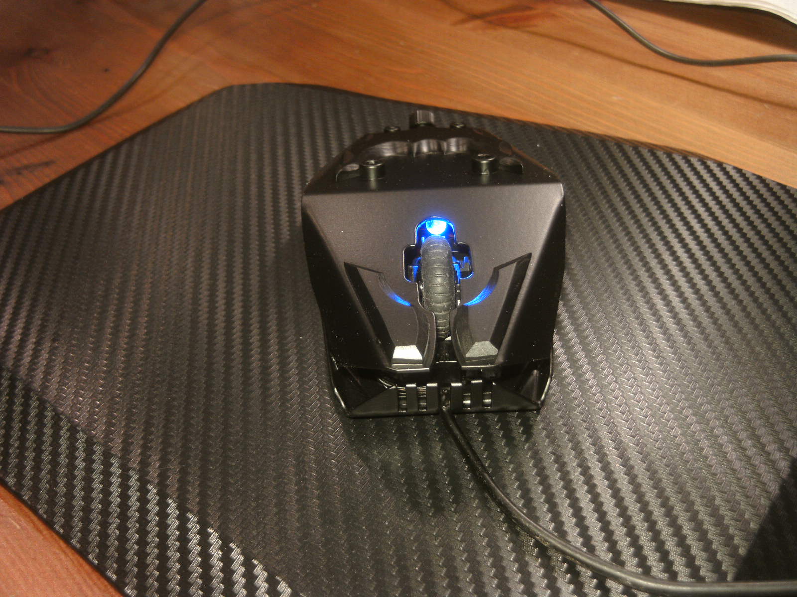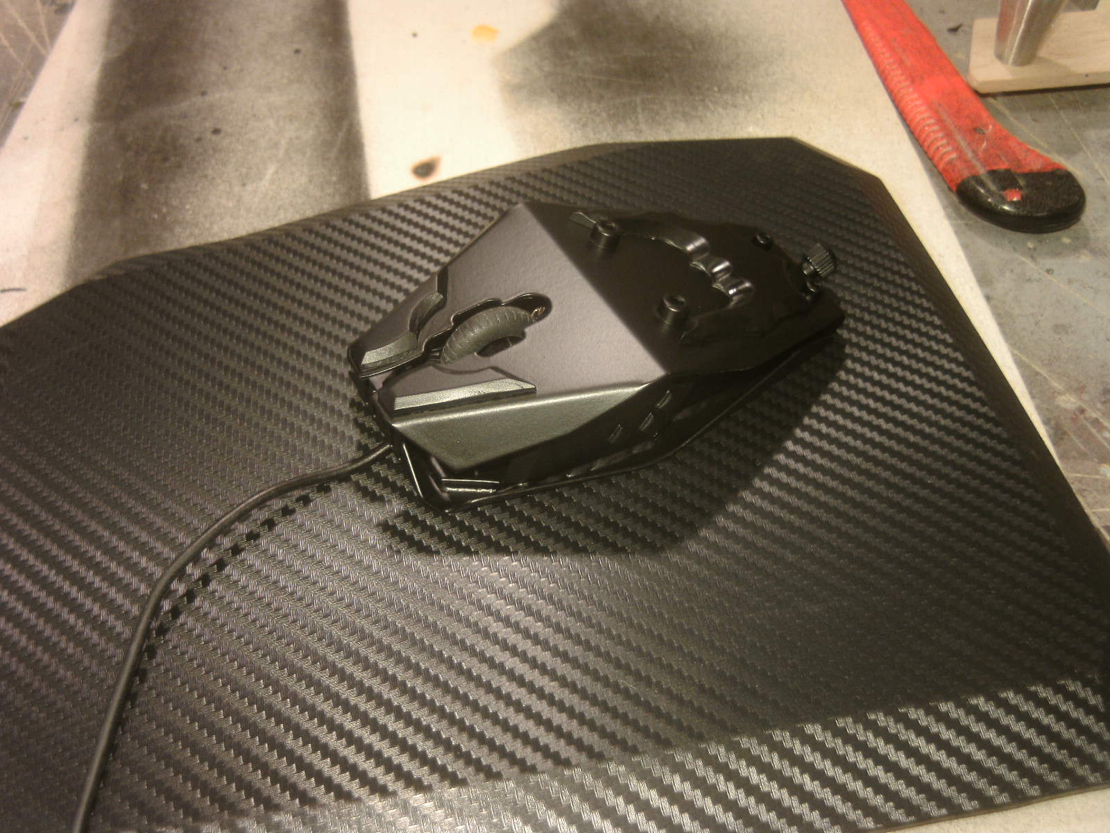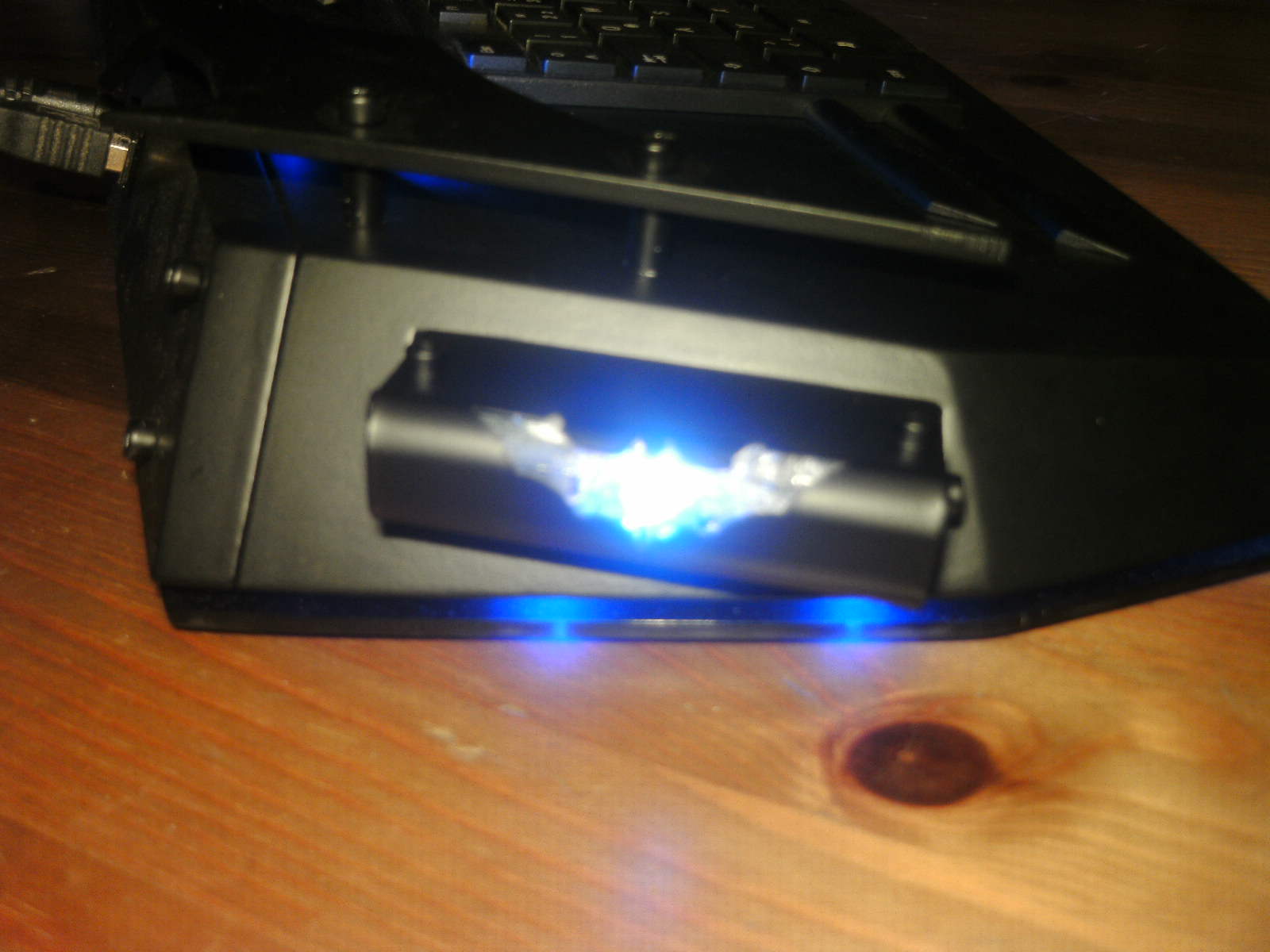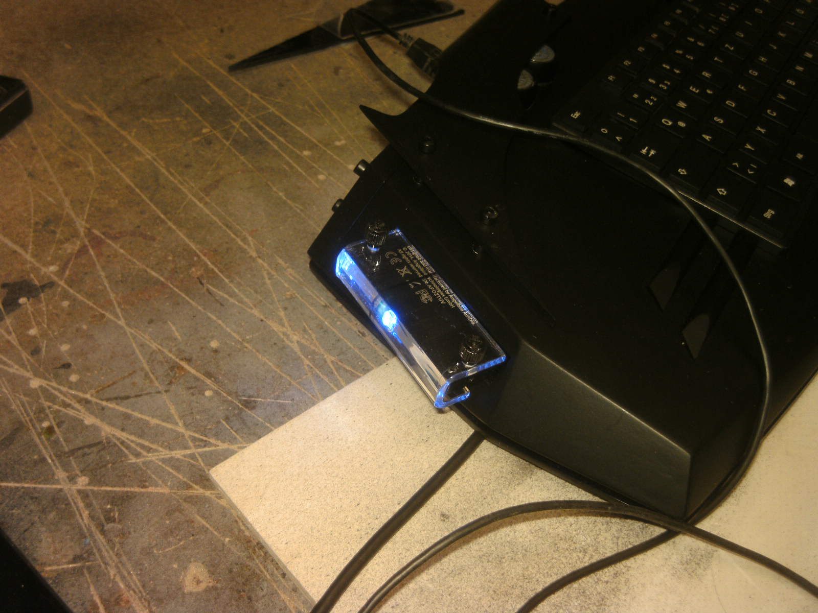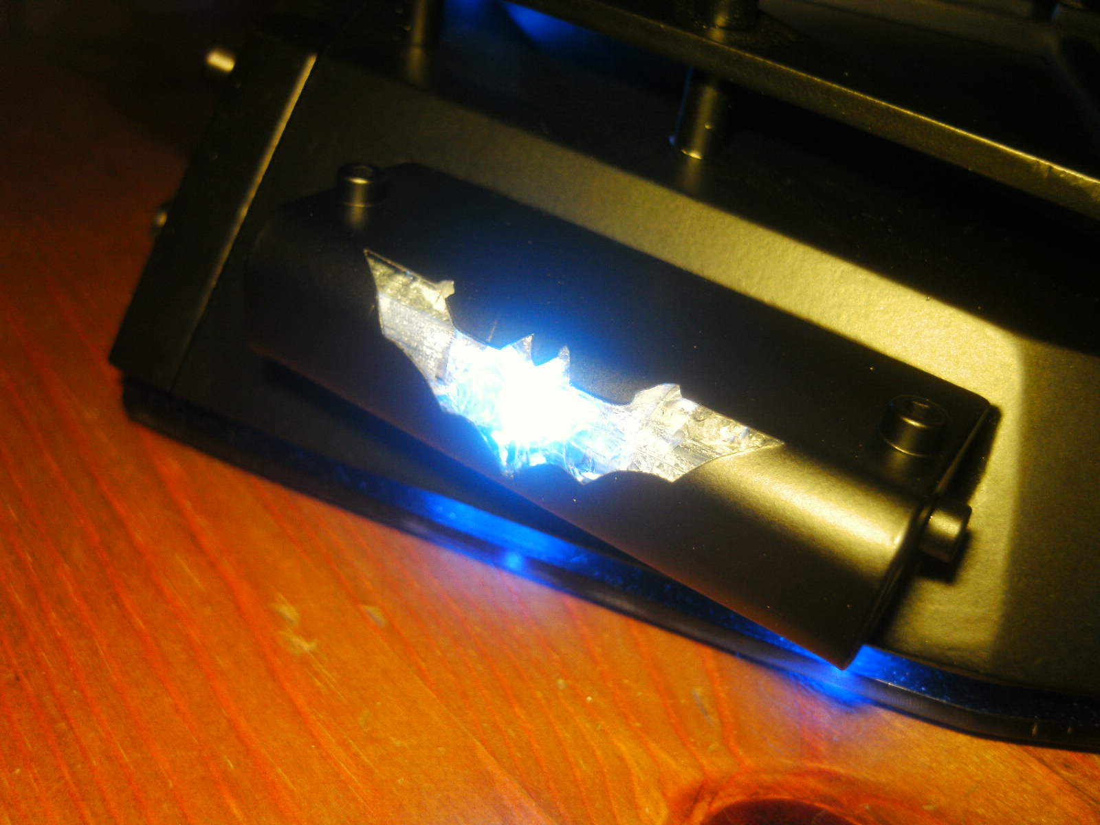 ja denke ich auch. mouse ist fertig, samt bat DK verzierungen. ein led habe ich auch in DK blau hinter dem rad eingelötet. nachdem ich es positiv getestet habe, habe auch das erste teile vom mousepad mit folie fertig, ein bodenplatte mache ich vielleicht nich, weis nicht. kaum zu glauben das es vor 4 tage noch ein hdd case war.Denke die Maus wird am ende sehr gut dazu passen.