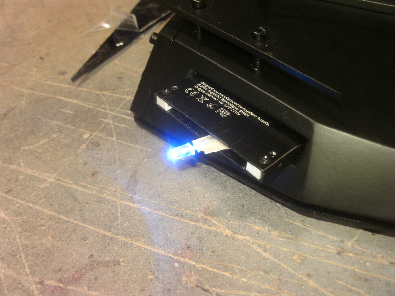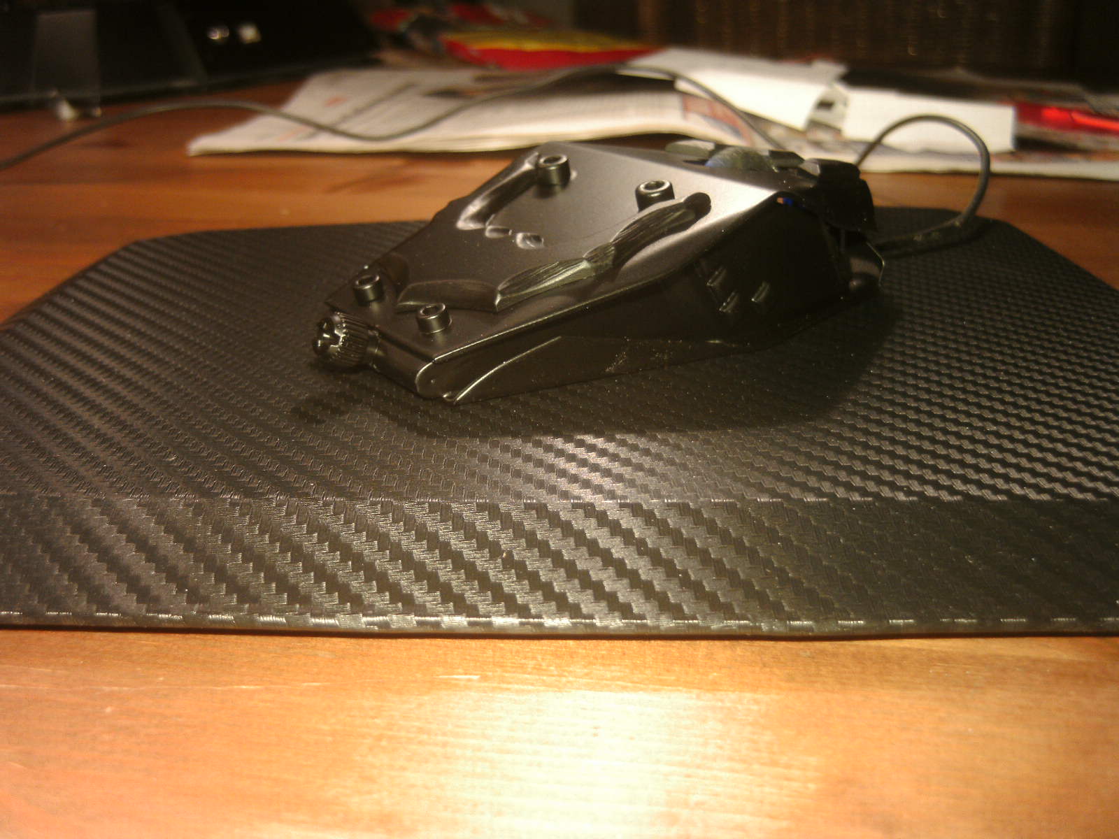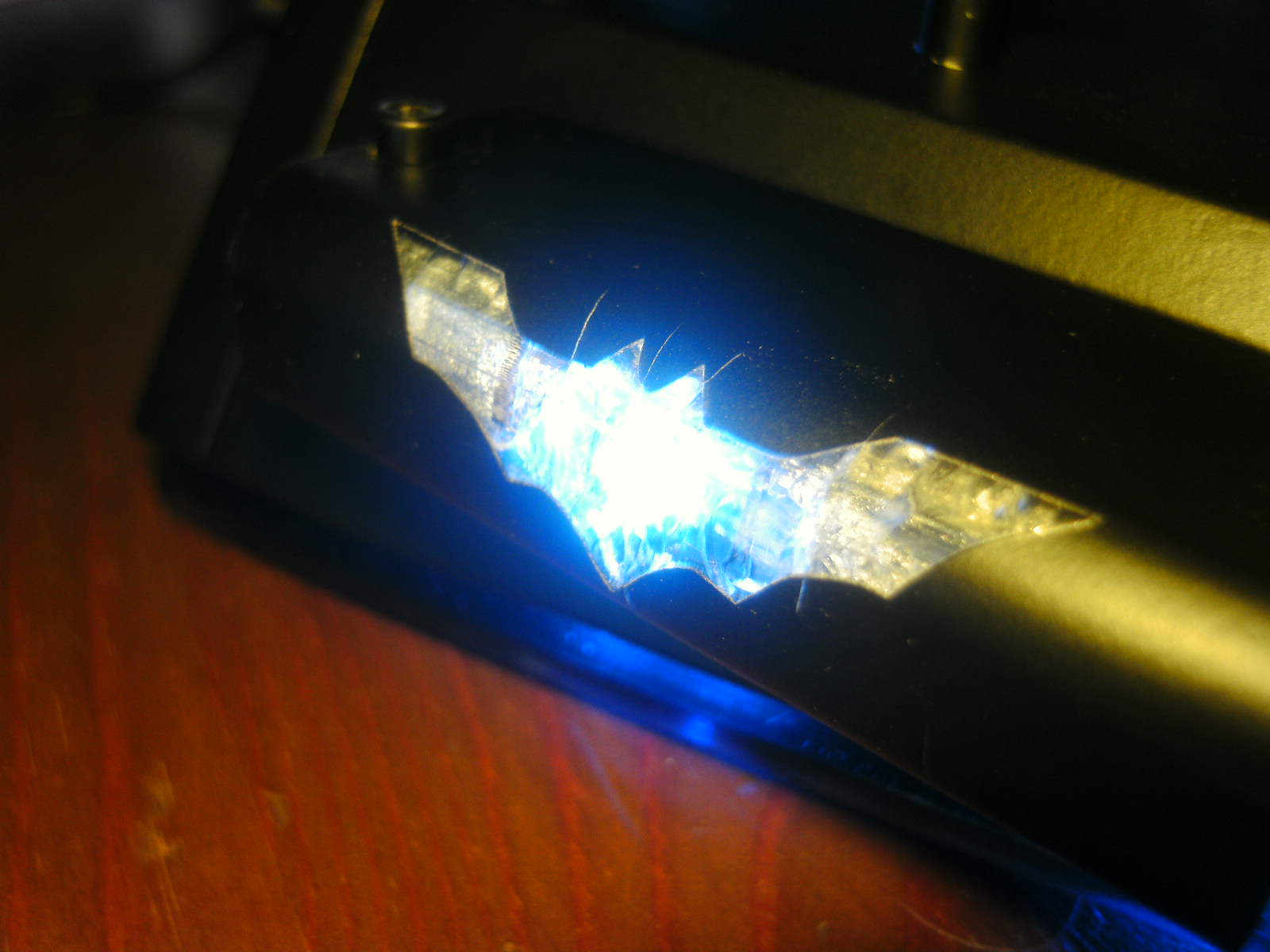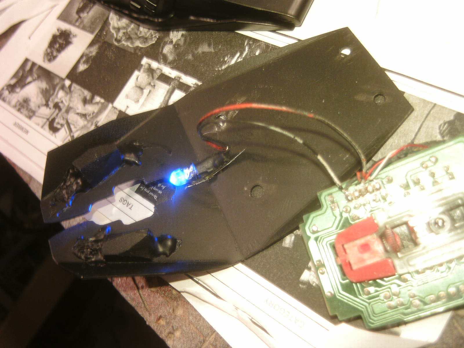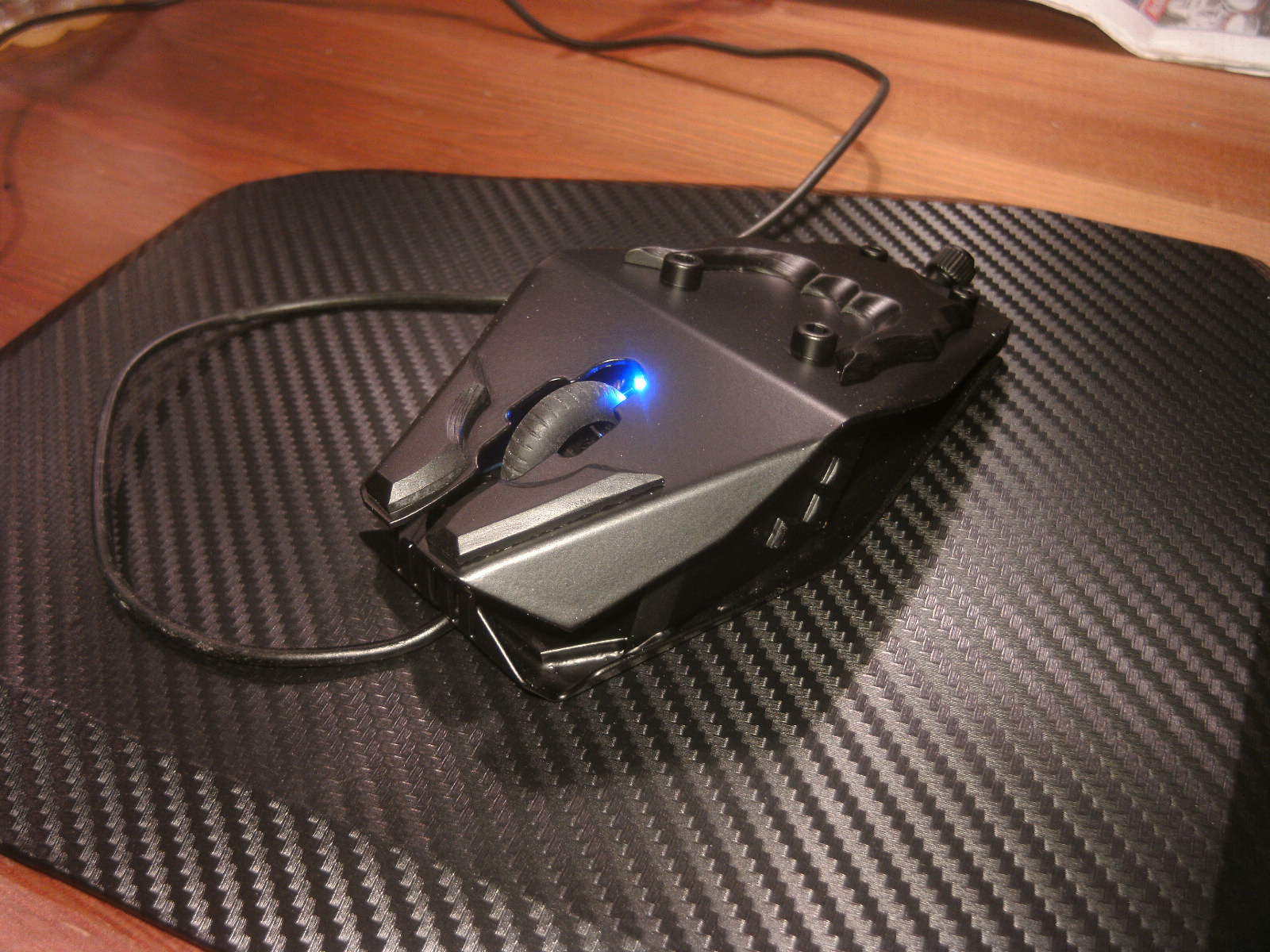 ja denke ich auch. mouse ist fertig, samt bat DK verzierungen. ein led habe ich auch in DK blau hinter dem rad eingelötet. nachdem ich es positiv getestet habe, habe auch das erste teile vom mousepad mit folie fertig, ein bodenplatte mache ich vielleicht nich, weis nicht. kaum zu glauben das es vor 4 tage noch ein hdd case war.Denke die Maus wird am ende sehr gut dazu passen.