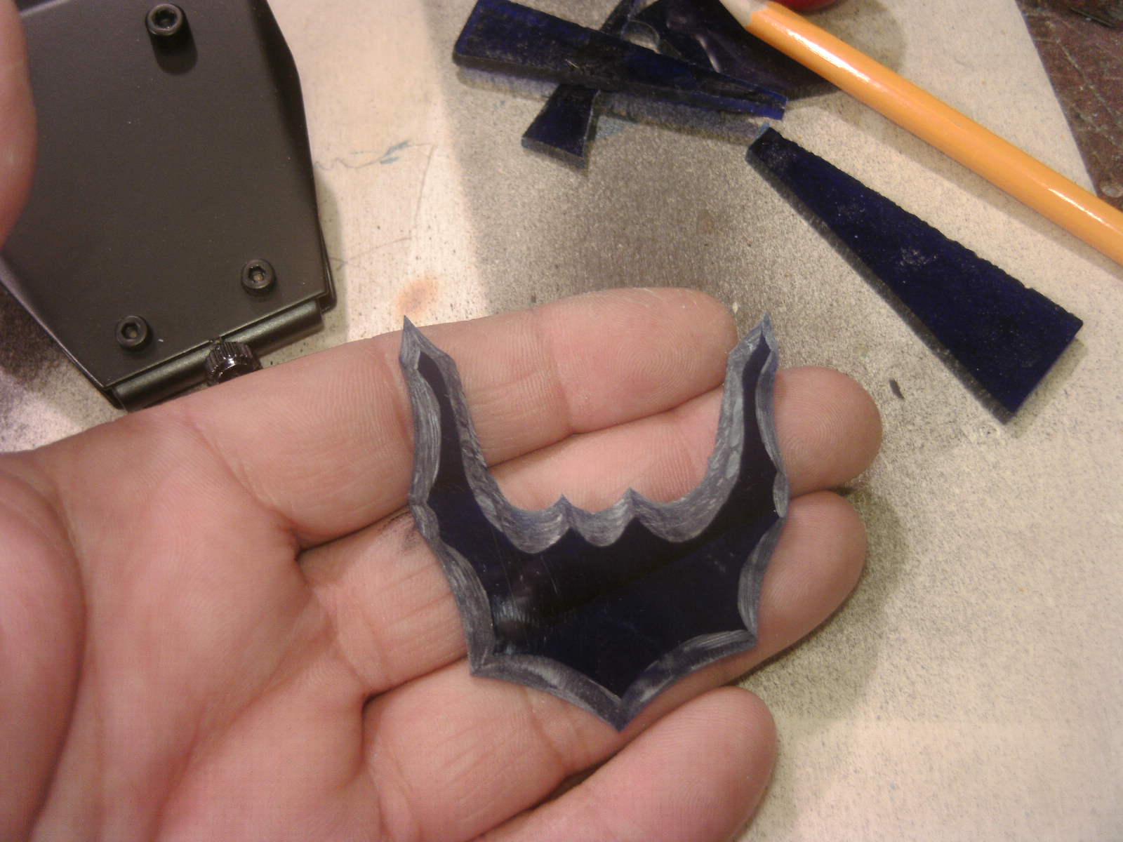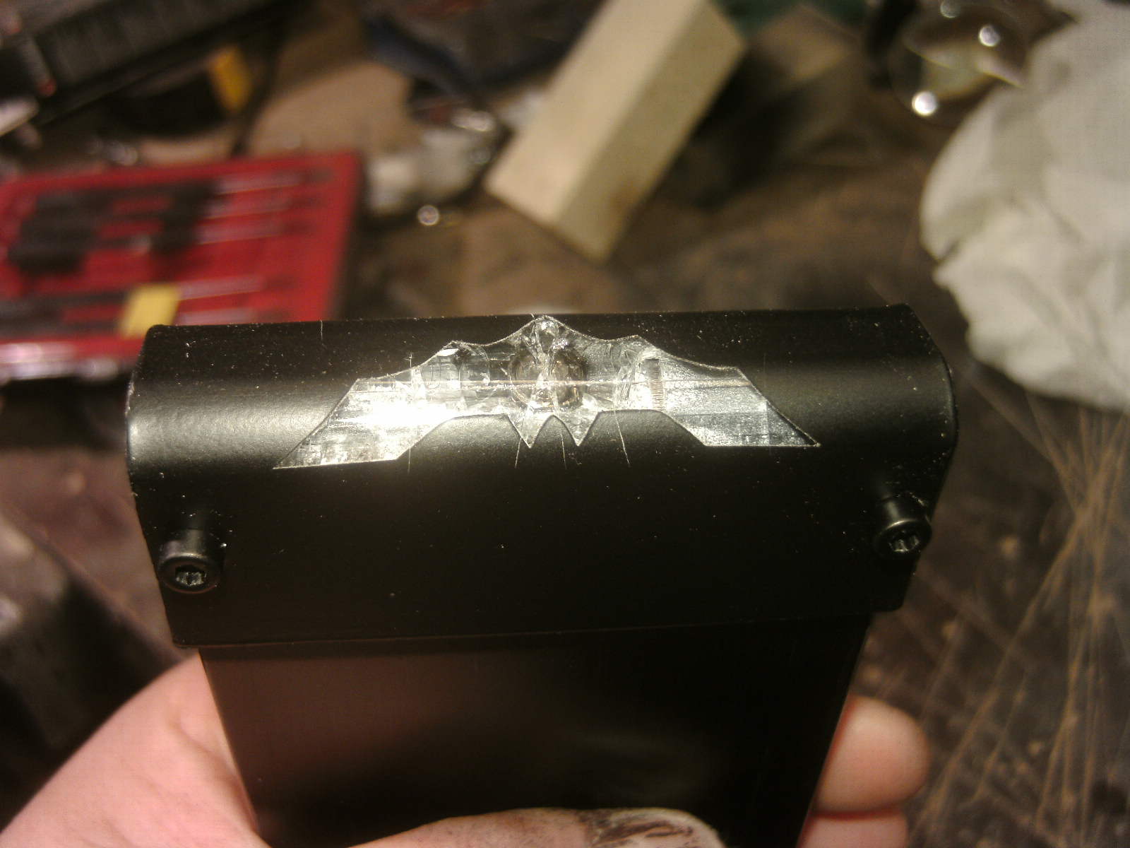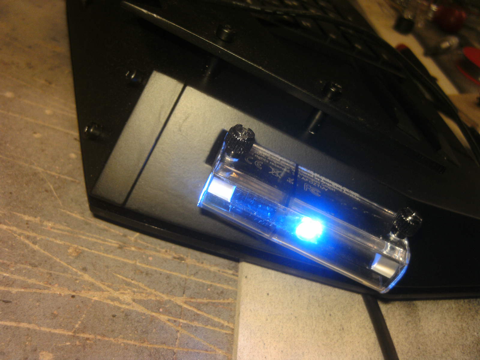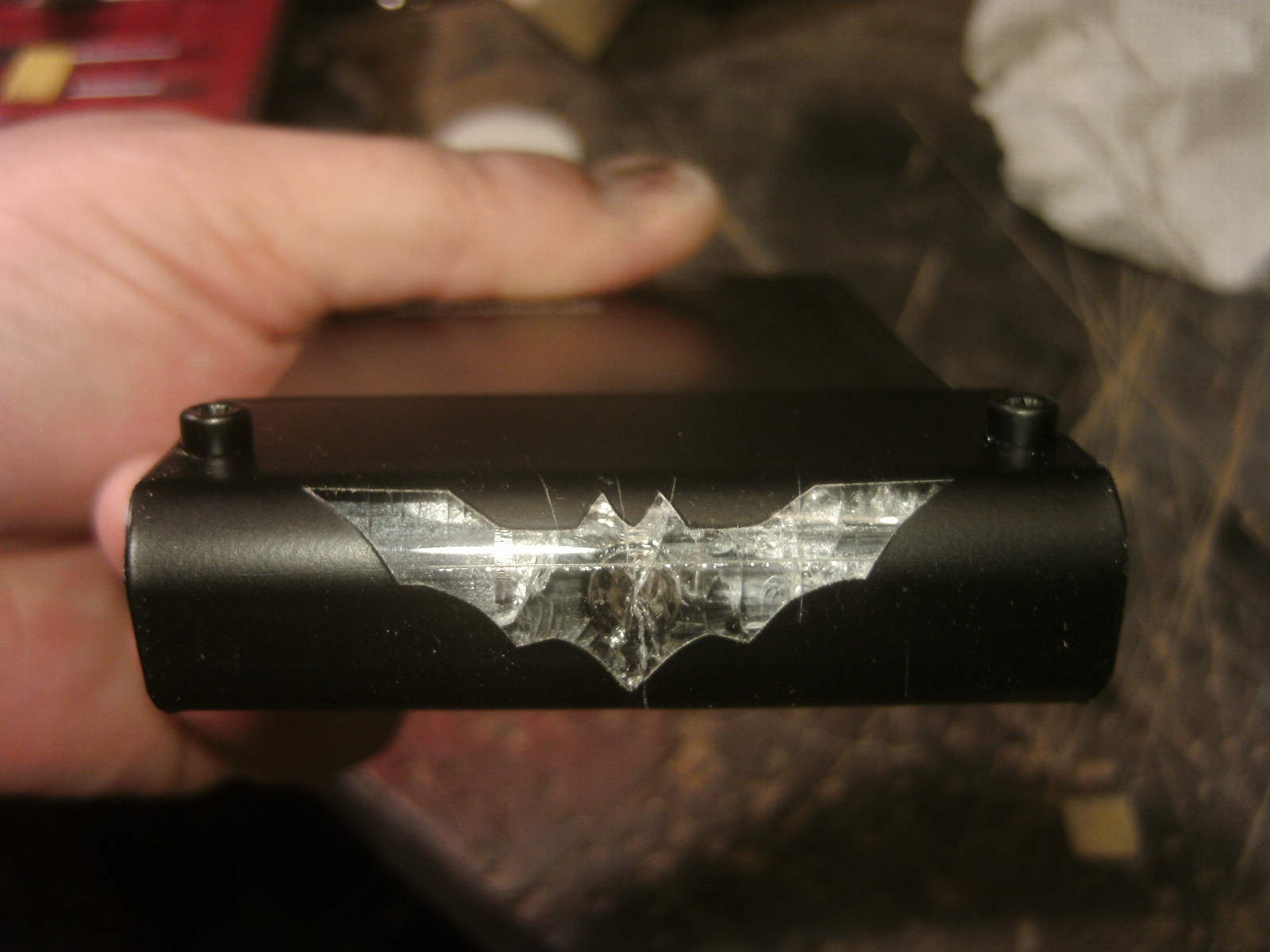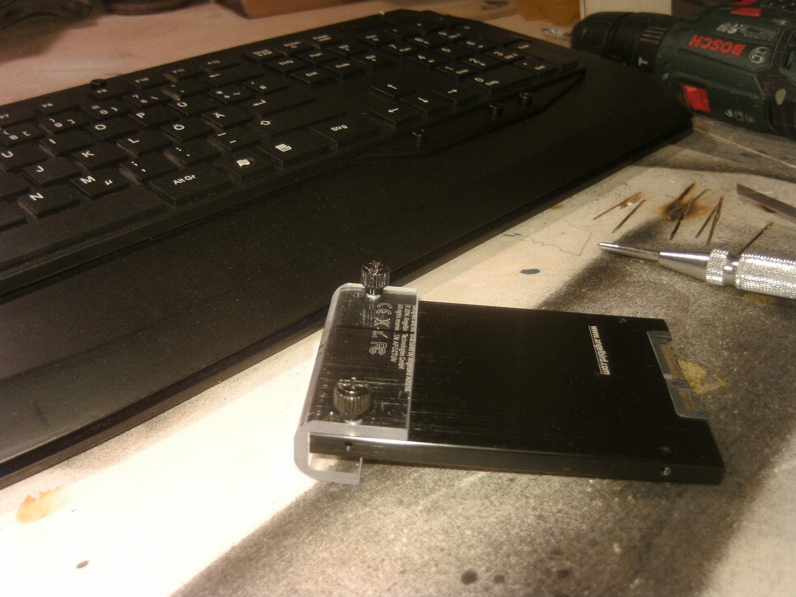 ja denke ich auch. mouse ist fertig, samt bat DK verzierungen. ein led habe ich auch in DK blau hinter dem rad eingelötet. nachdem ich es positiv getestet habe, habe auch das erste teile vom mousepad mit folie fertig, ein bodenplatte mache ich vielleicht nich, weis nicht. kaum zu glauben das es vor 4 tage noch ein hdd case war.Denke die Maus wird am ende sehr gut dazu passen.