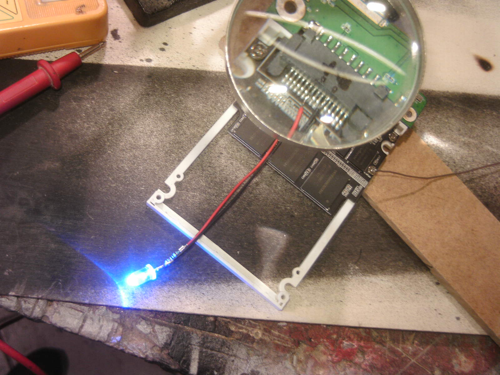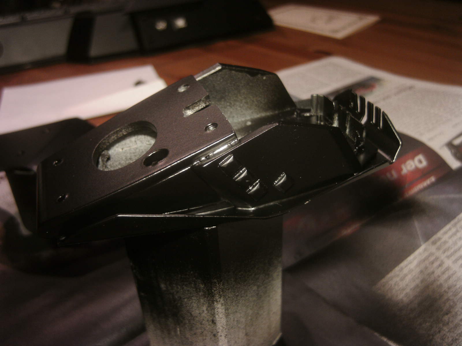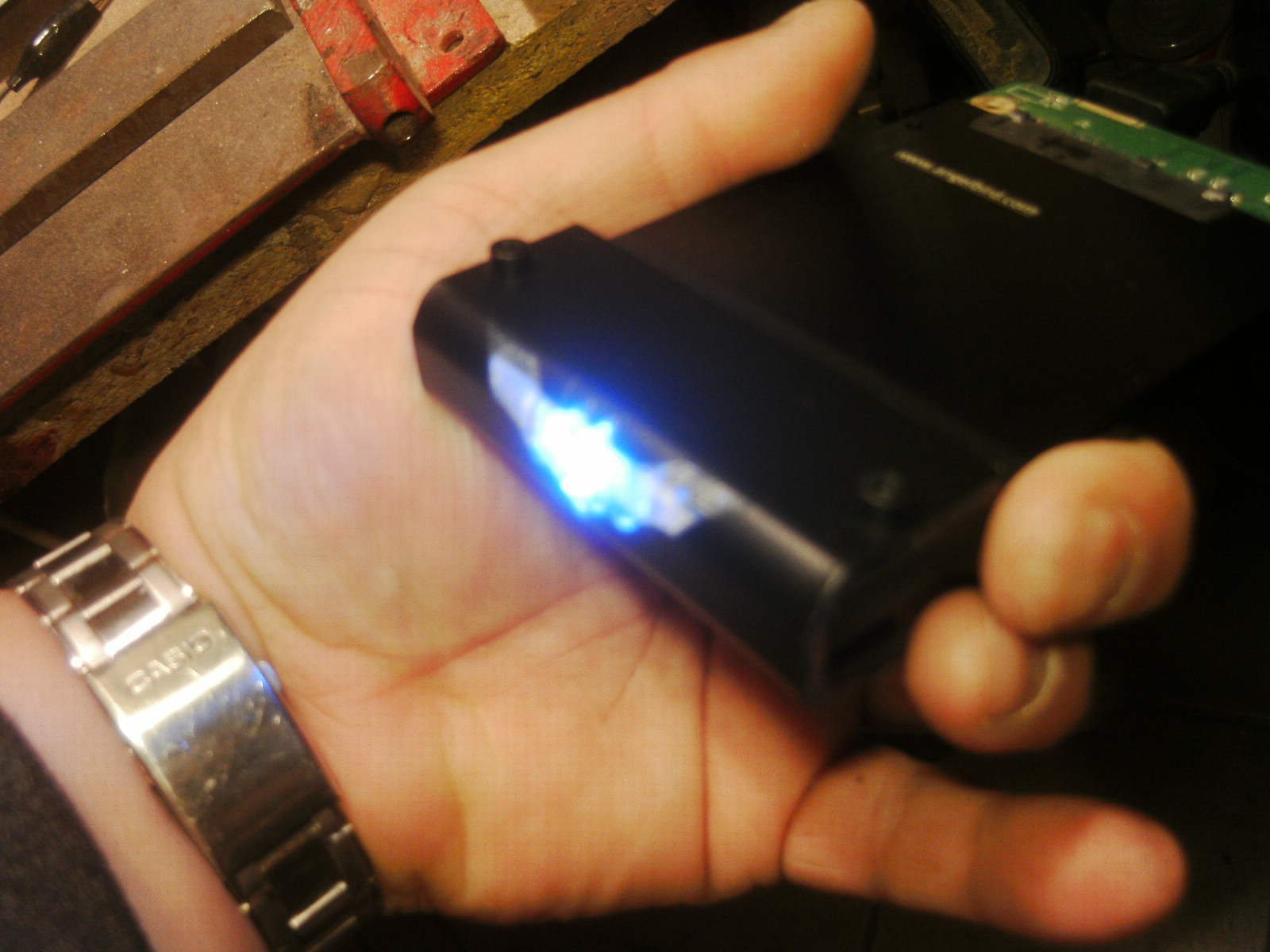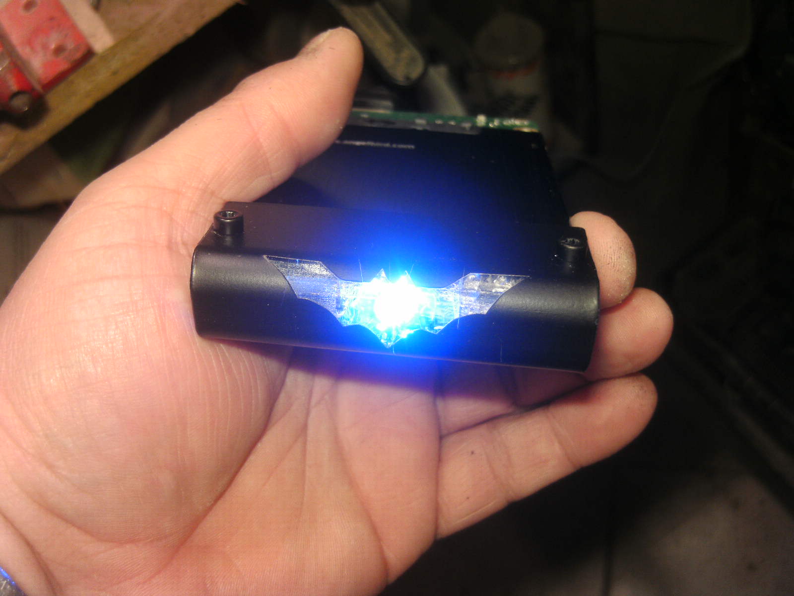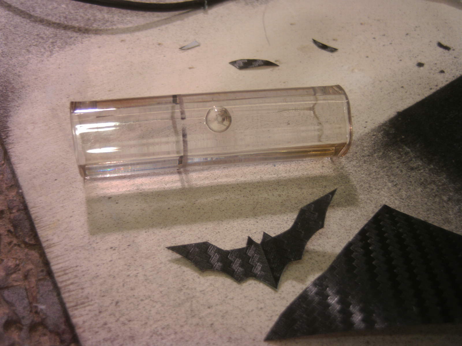 ja denke ich auch. mouse ist fertig, samt bat DK verzierungen. ein led habe ich auch in DK blau hinter dem rad eingelötet. nachdem ich es positiv getestet habe, habe auch das erste teile vom mousepad mit folie fertig, ein bodenplatte mache ich vielleicht nich, weis nicht. kaum zu glauben das es vor 4 tage noch ein hdd case war.Denke die Maus wird am ende sehr gut dazu passen.