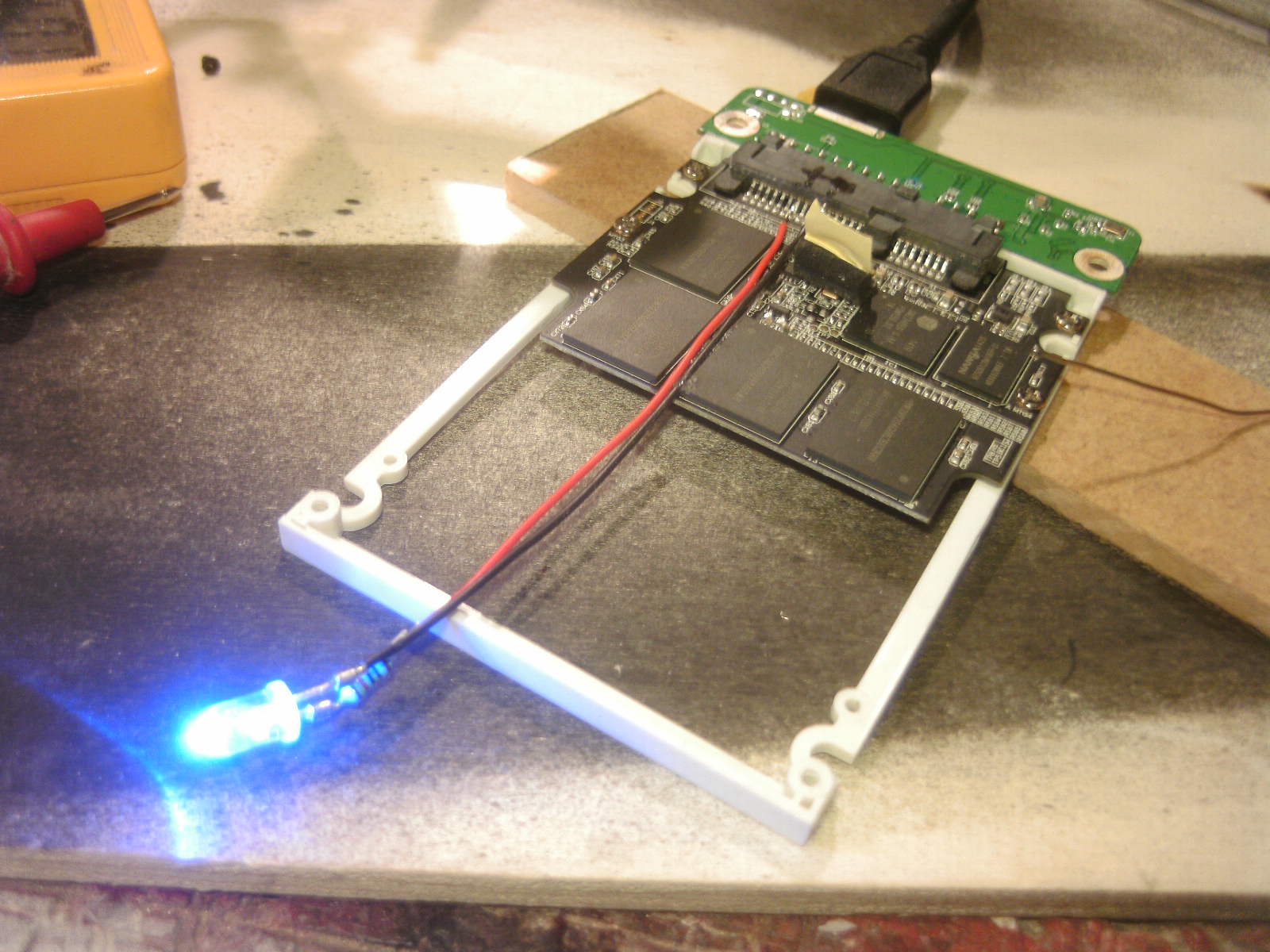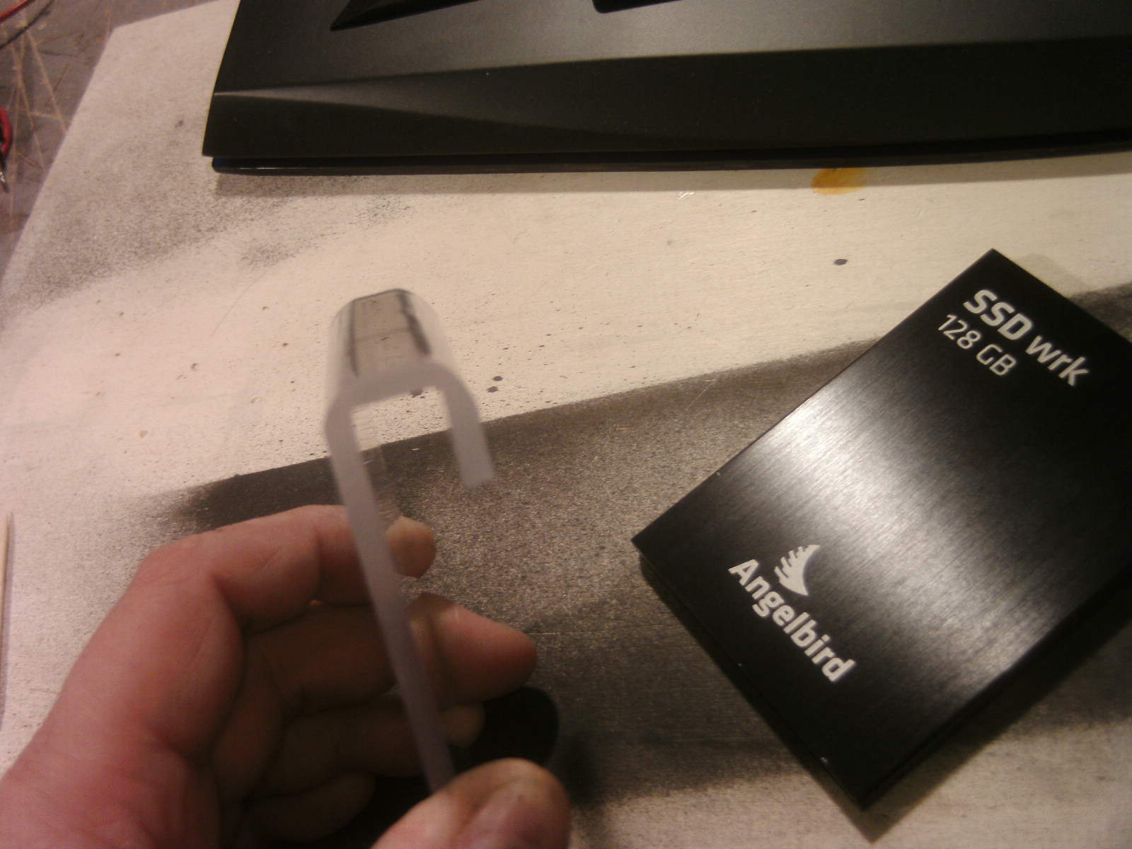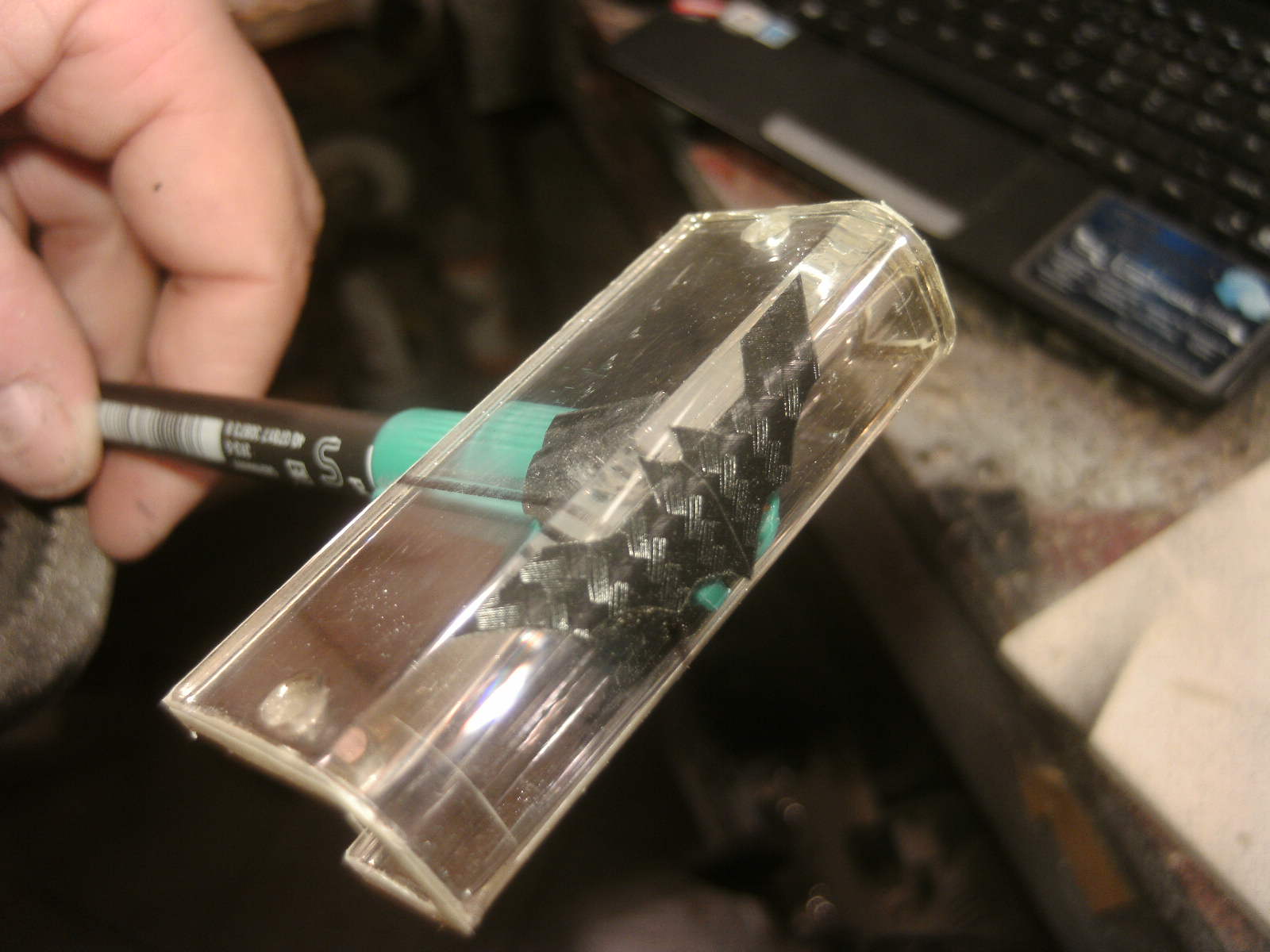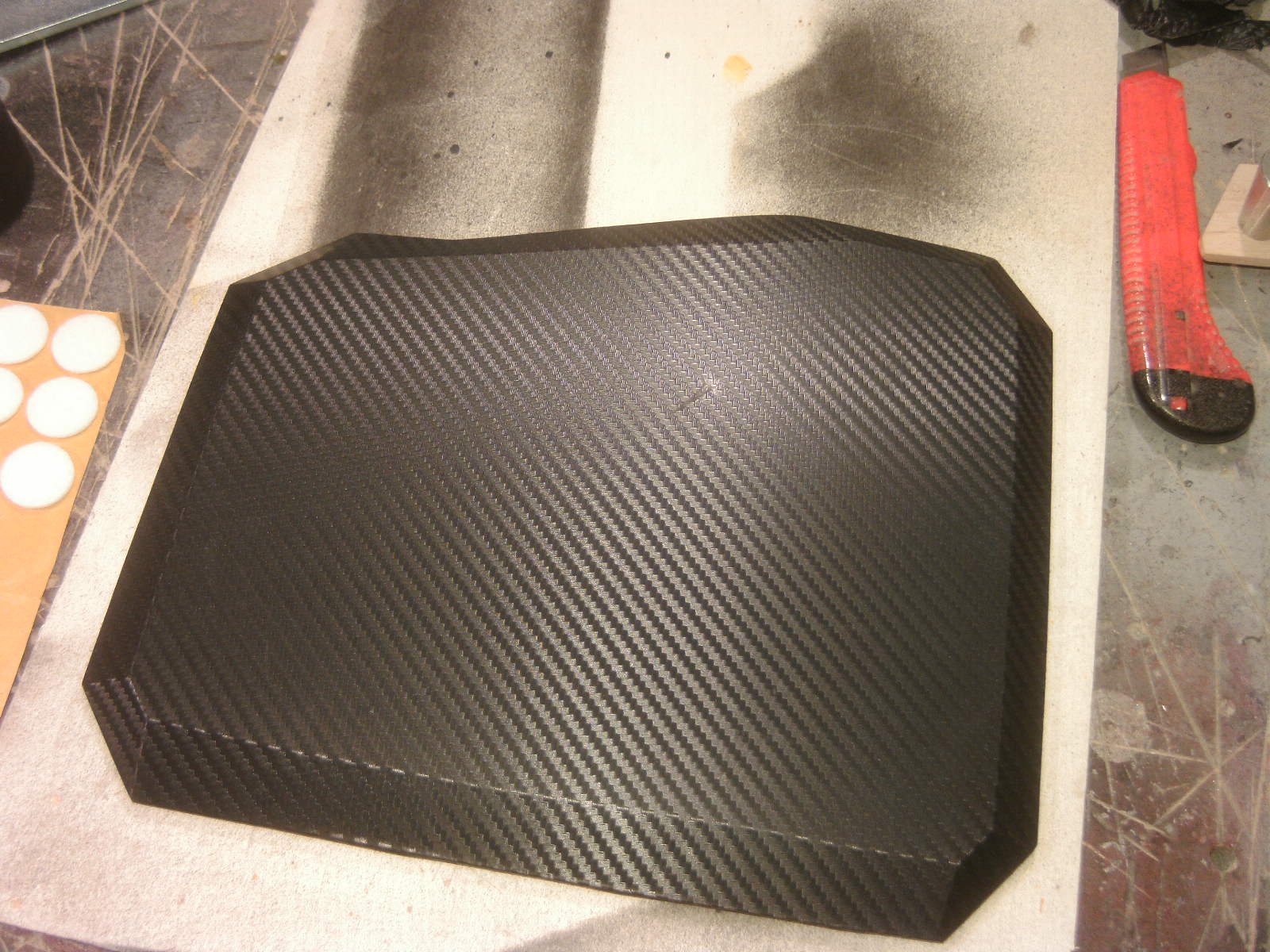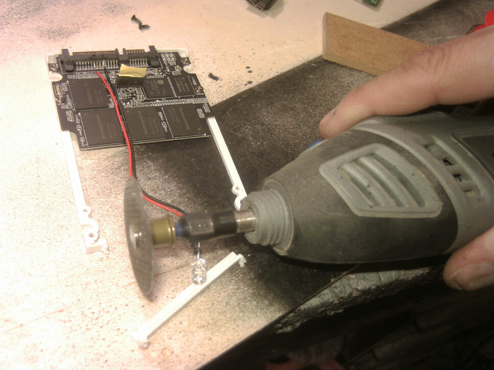 ja denke ich auch. mouse ist fertig, samt bat DK verzierungen. ein led habe ich auch in DK blau hinter dem rad eingelötet. nachdem ich es positiv getestet habe, habe auch das erste teile vom mousepad mit folie fertig, ein bodenplatte mache ich vielleicht nich, weis nicht. kaum zu glauben das es vor 4 tage noch ein hdd case war.Denke die Maus wird am ende sehr gut dazu passen.