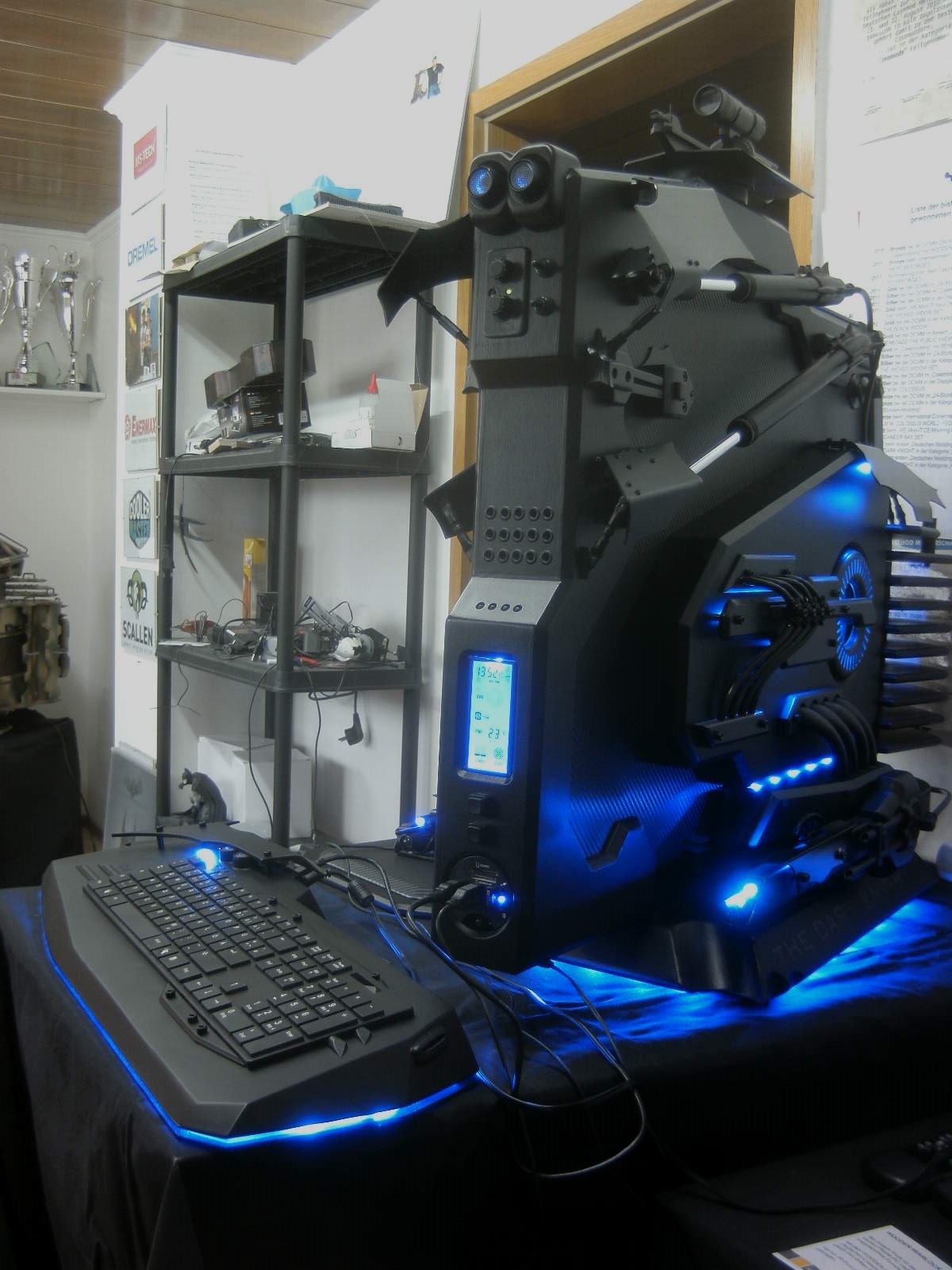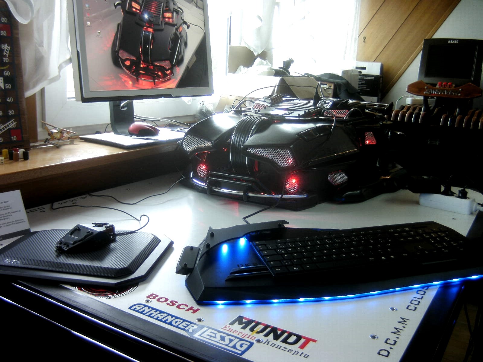 Es ist ein sehr DK stealthy und eckige form. darauf habe ich wie beim DK Mod auch ein batlogo als design element genommen und die rechte hälfte von das Batlogo als LED cover gebaut, so kamen ein paar bat rundungen in das sonst stealthy design. alle 6 kannt schrauben sind genau wie in das ganze DK bau style. auch die verzierungen, so aber das sie beim schreiben nicht stören.