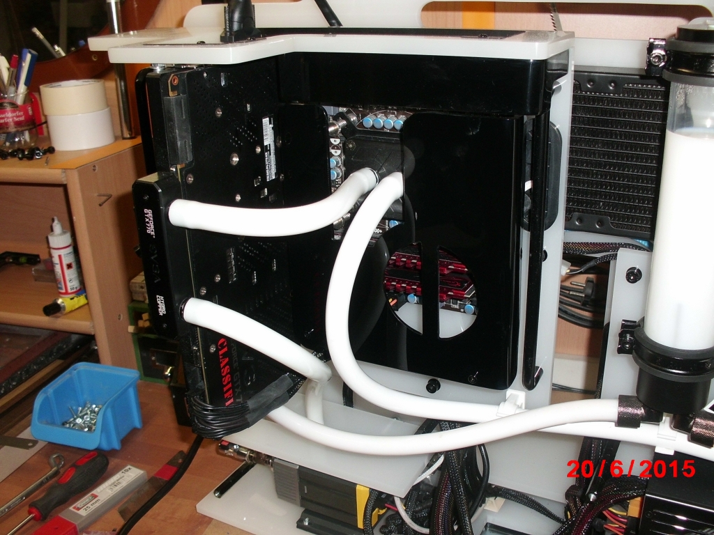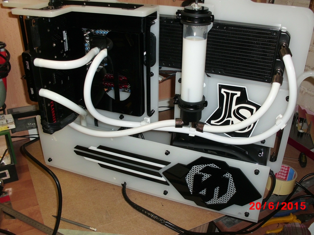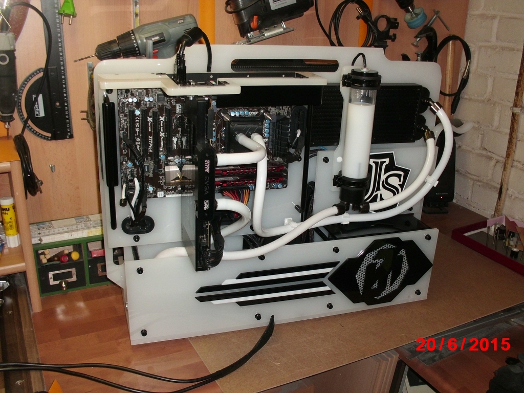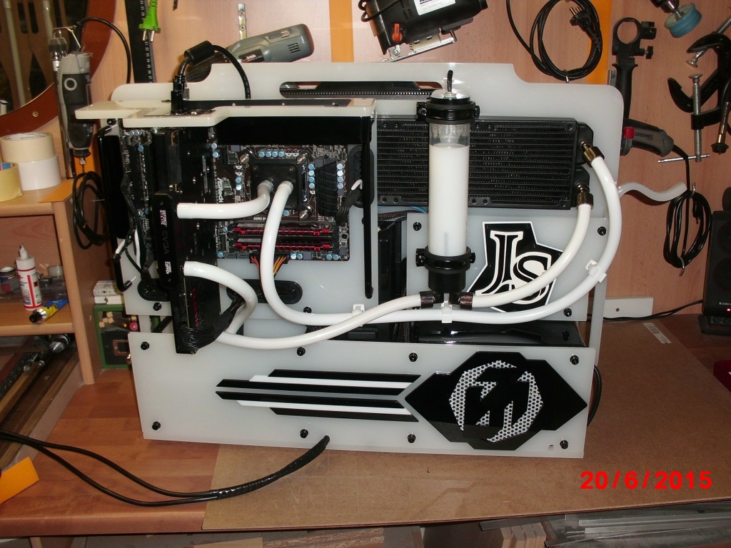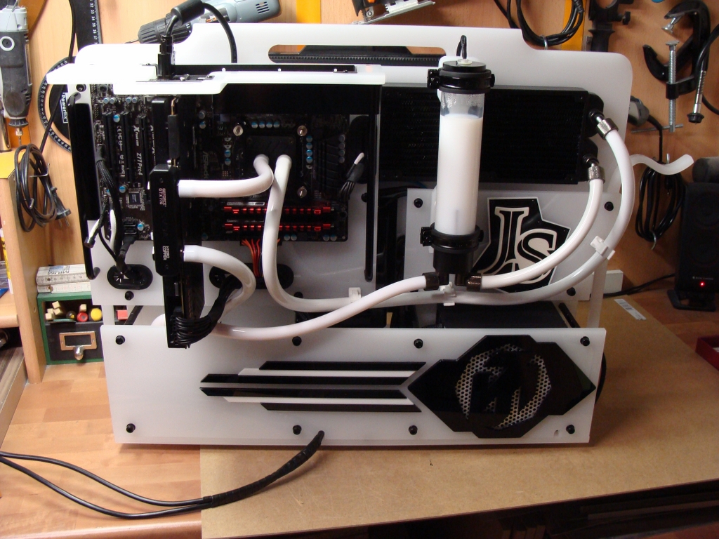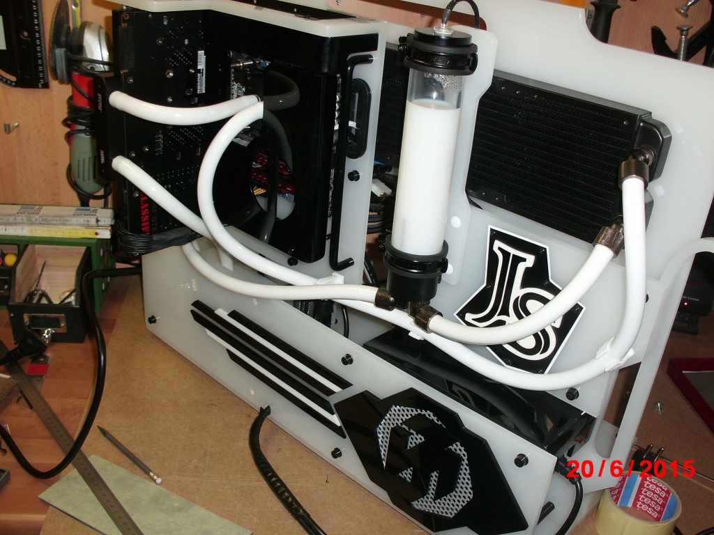 Echt super arbeit, aber eins hab ich jetzt gesehen was mir nicht so gefällt, und zwar die Halter mit denen die die Schläuche fest gemacht hast. Diese würde ich auch noch aus 3 Schichten Plexi selber machen. Weis/Schwarz/Weis zusammen kleben, dann ein Loch rein Bohren und aufschneiden. Dann kannst da den Schlauch genauso einklipsen und es passt besser dazu.