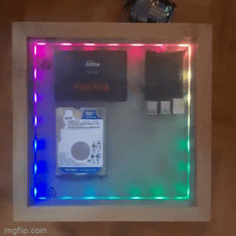 Ich bin mit dem Ergebnis sehr zufrieden! Neben vielen Umbauten am eigentlichen Bilderrahmen habe ich das Innere des Gehäuses mit einem Echtstein-Furnier verkleidet und einen LED-Streifen im Rahmen integriert. Sobald der LED-Streifen eingeschaltet ist, leuchtet er durch das Furnier hindurch. Als zusätzliches Feature habe ich eine aktive Belüftung hinter dem runden Objekt in der Mitte integriert.