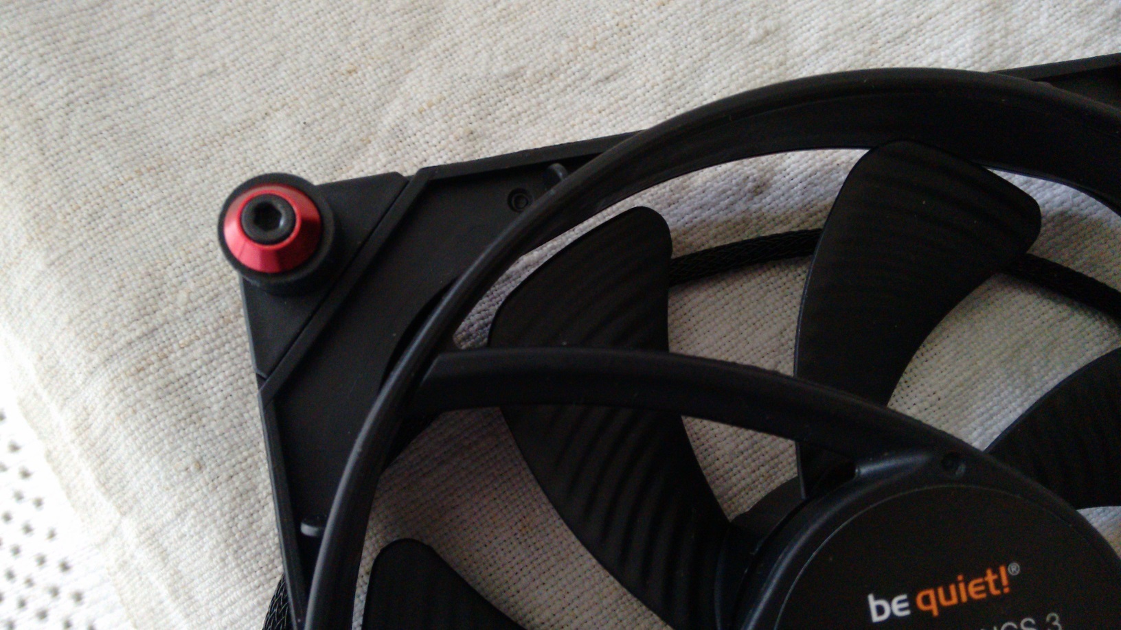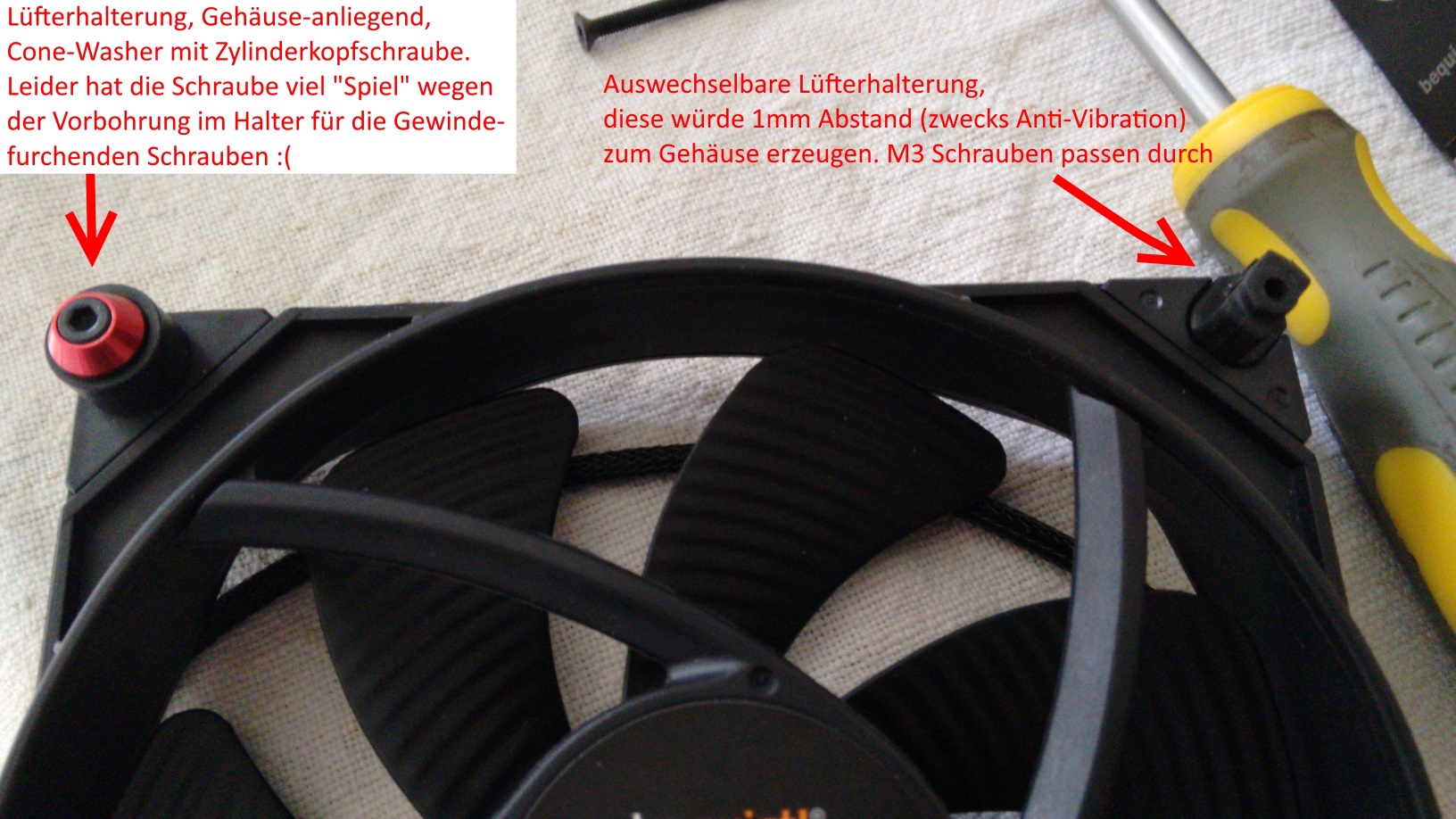Problem c) Ich habe Be-Quiet Silent Wings 3 geholt. Diese könnte man (auf normalen Wege) so montieren, dass die Lüfter selbst 1mm Abstand zum Gehäuse hätten, Thema Anti-Vibration etc. siehe angehängte Bilder
