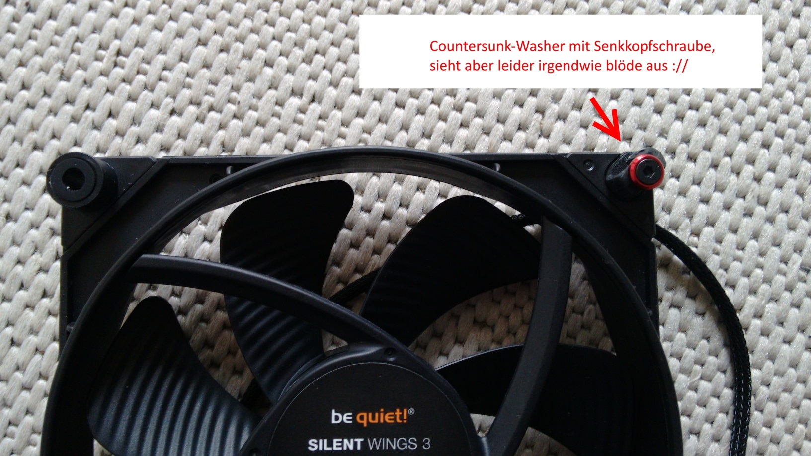 Problem a) sogut wie jeder Lüfter hat diese doofen Gewindefurchenden Schrauben dabei, und daher recht größe Löcher, wo besagte Schrauben durchkommen.